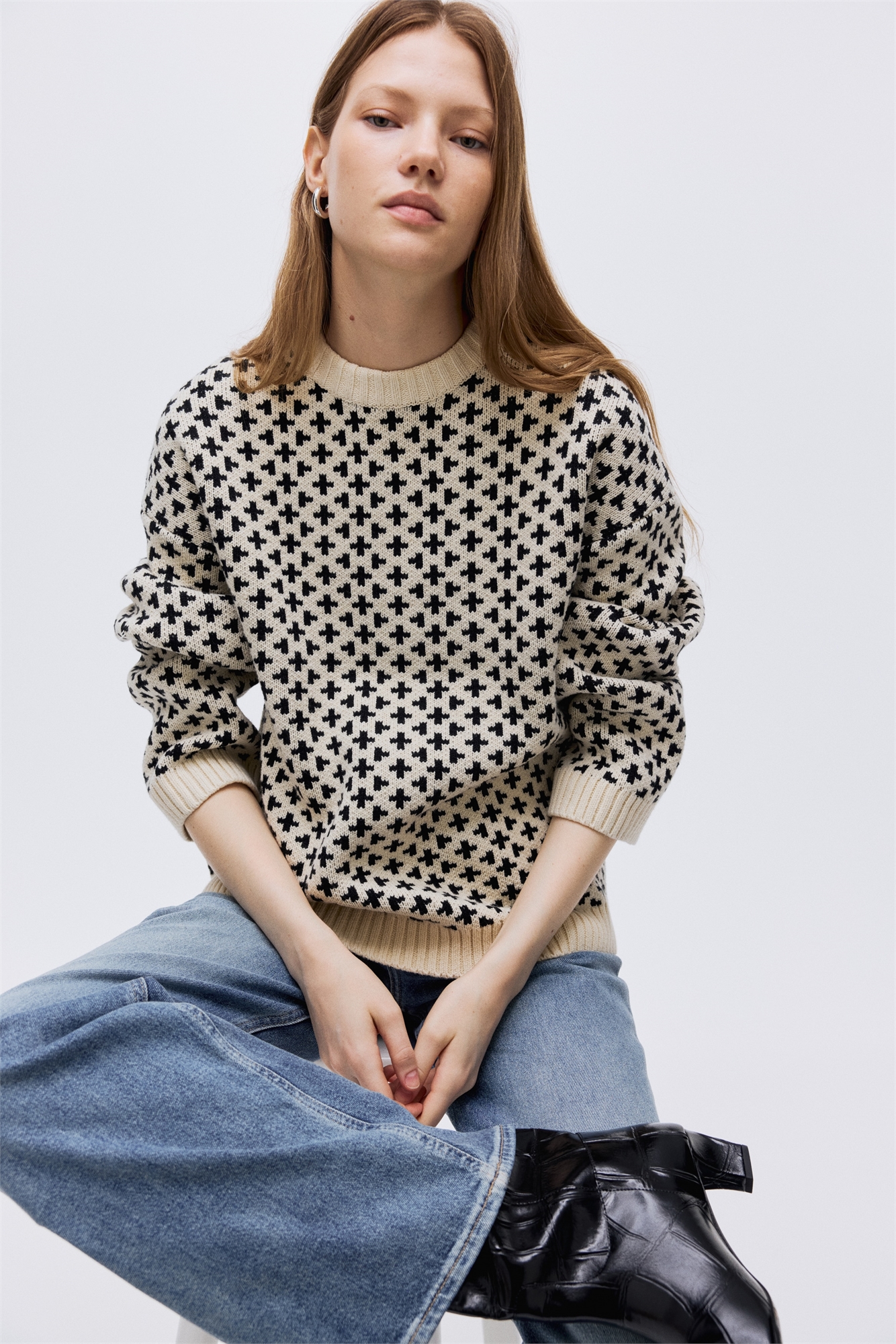 Джемпер большого размера из хлопкового микса с жаккардовой вязкой. Круглый ребристый вырез, спущенные плечи и длинные рукава. Ребристые манжеты и подол.