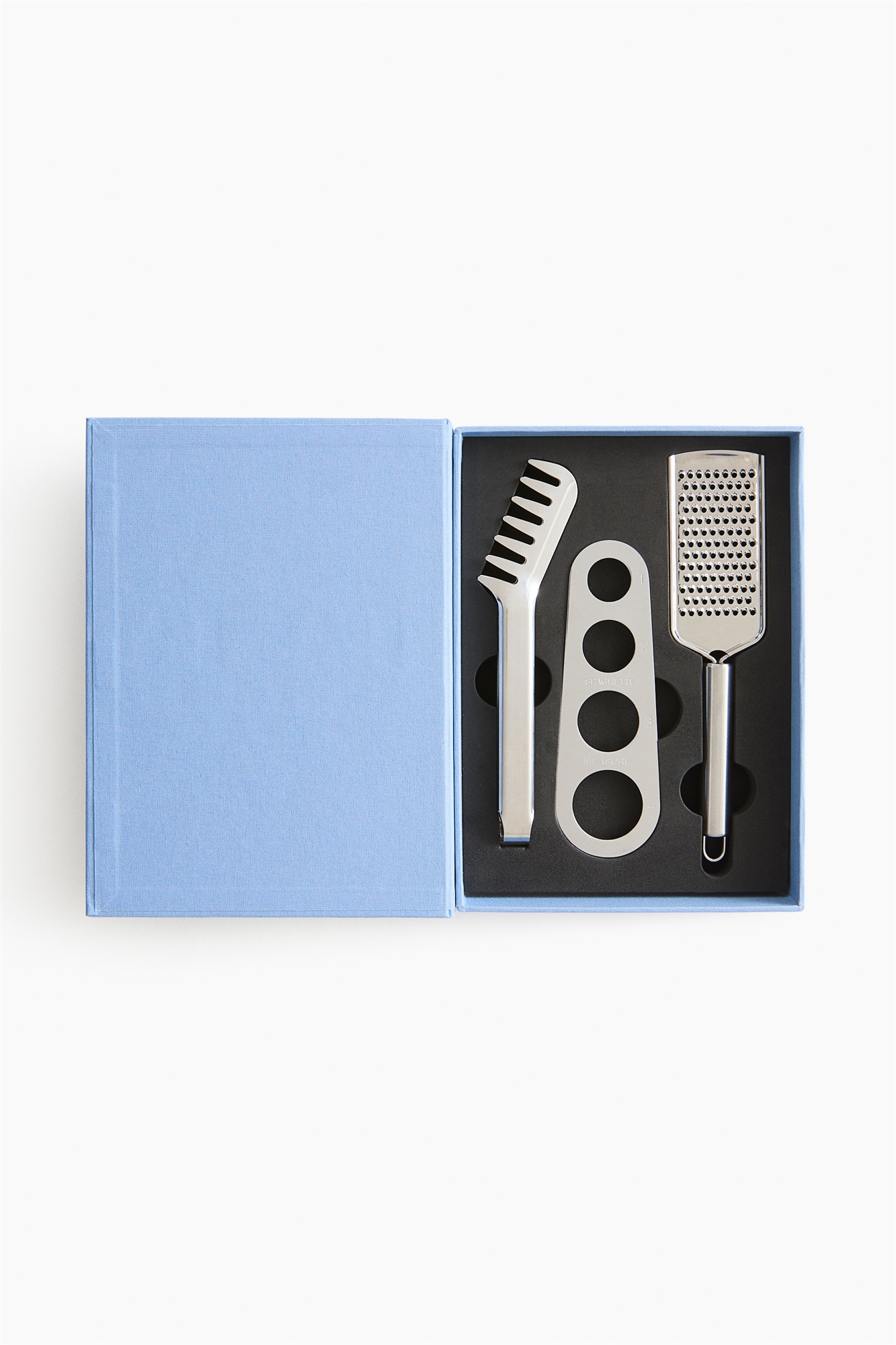 Откройте для себя наш незаменимый набор для вечера пасты, ловко замаскированный под элегантную коробку, похожую на книгу. Это идеальное сочетание эстетики и функциональности. Открыв ее, вы обнаружите все необходимые инструменты для проведения успешных ужинов с макаронами. Все инструменты изготовлены из нержавеющей стали и безопасны для мытья в посудомоечной машине. В набор входят: один прибор для отмеривания спагетти, один щипцы для сервировки и одна терка. Глубина 5 см. Ширина 20 см. Высота 27,5 см.