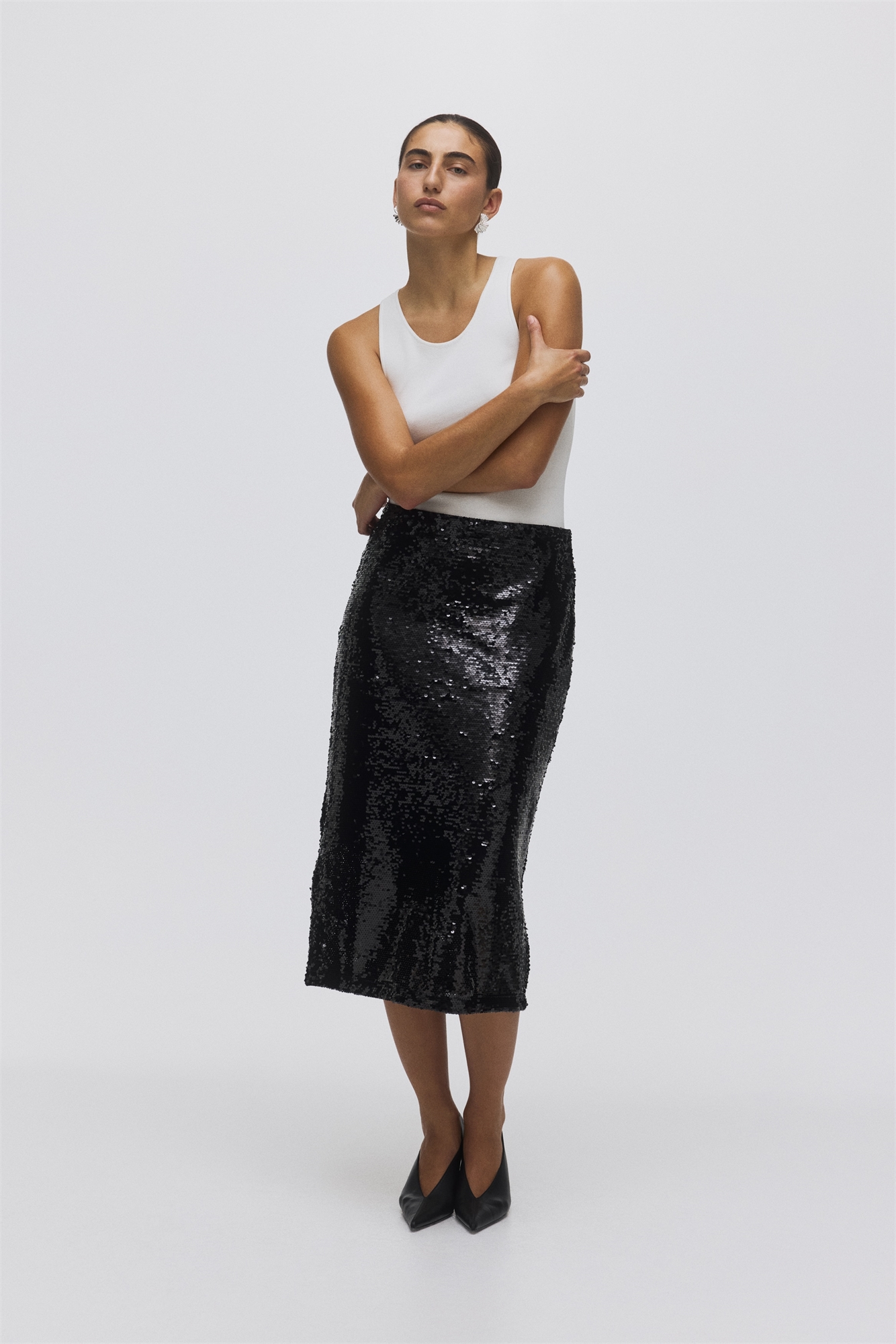 Юбка длиной до колен из сетки с блестками, с высокой талией и потайной застежкой-молнией с одной стороны. Подол прямого покроя с разрезом с одной стороны. Подкладка из джерси.