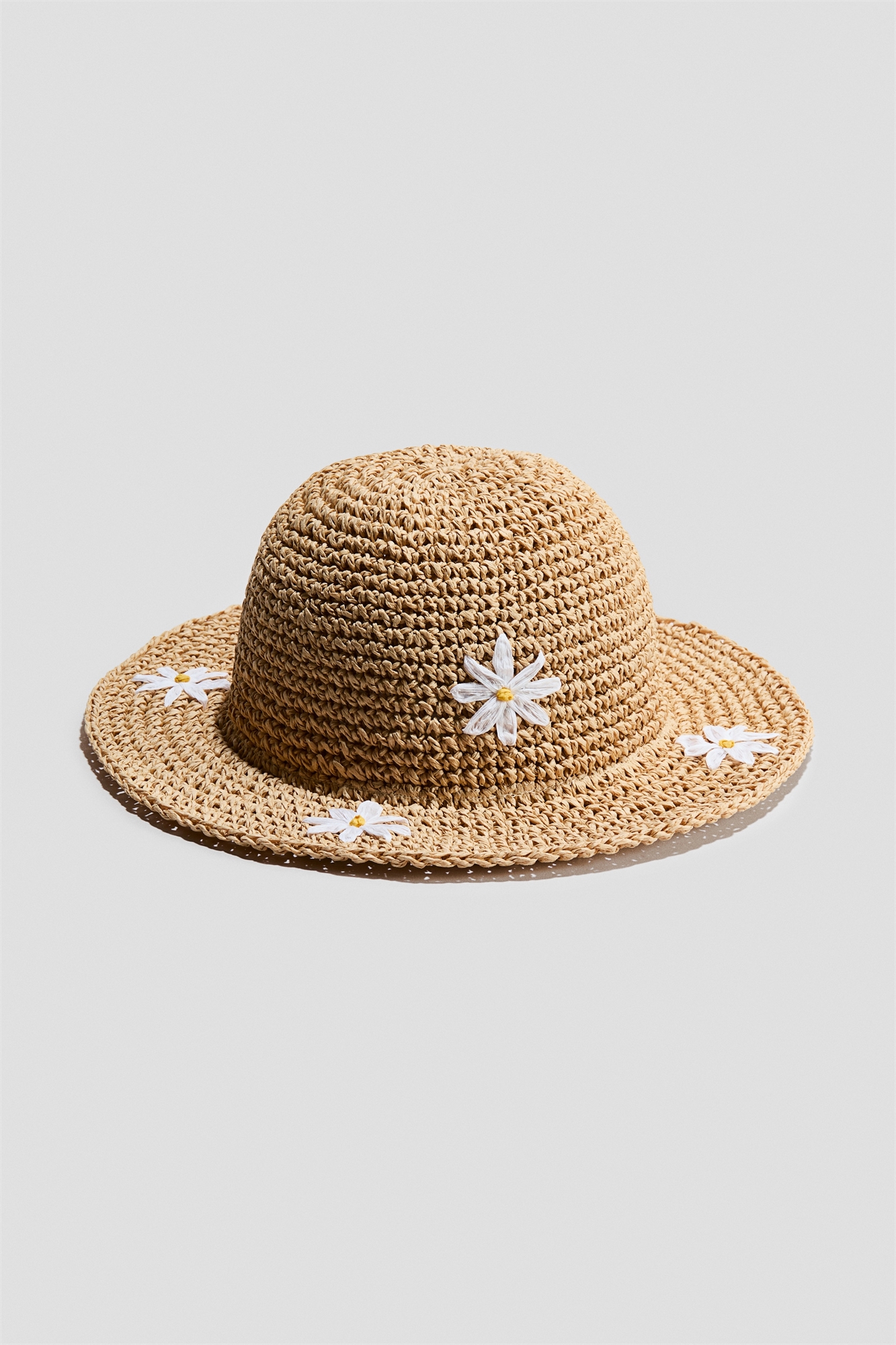 Шляпа из плетеной бумажной соломы с аппликациями по всей поверхности и тканым потником. Закругленная тулья и плоские поля.