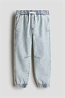 Джоггеры из хлопкового денима с эластичным утягивающим поясом, фальшивой ширинкой и боковыми карманами. Прямые ноги с вытачками на коленях и эластичными вставками по краям.