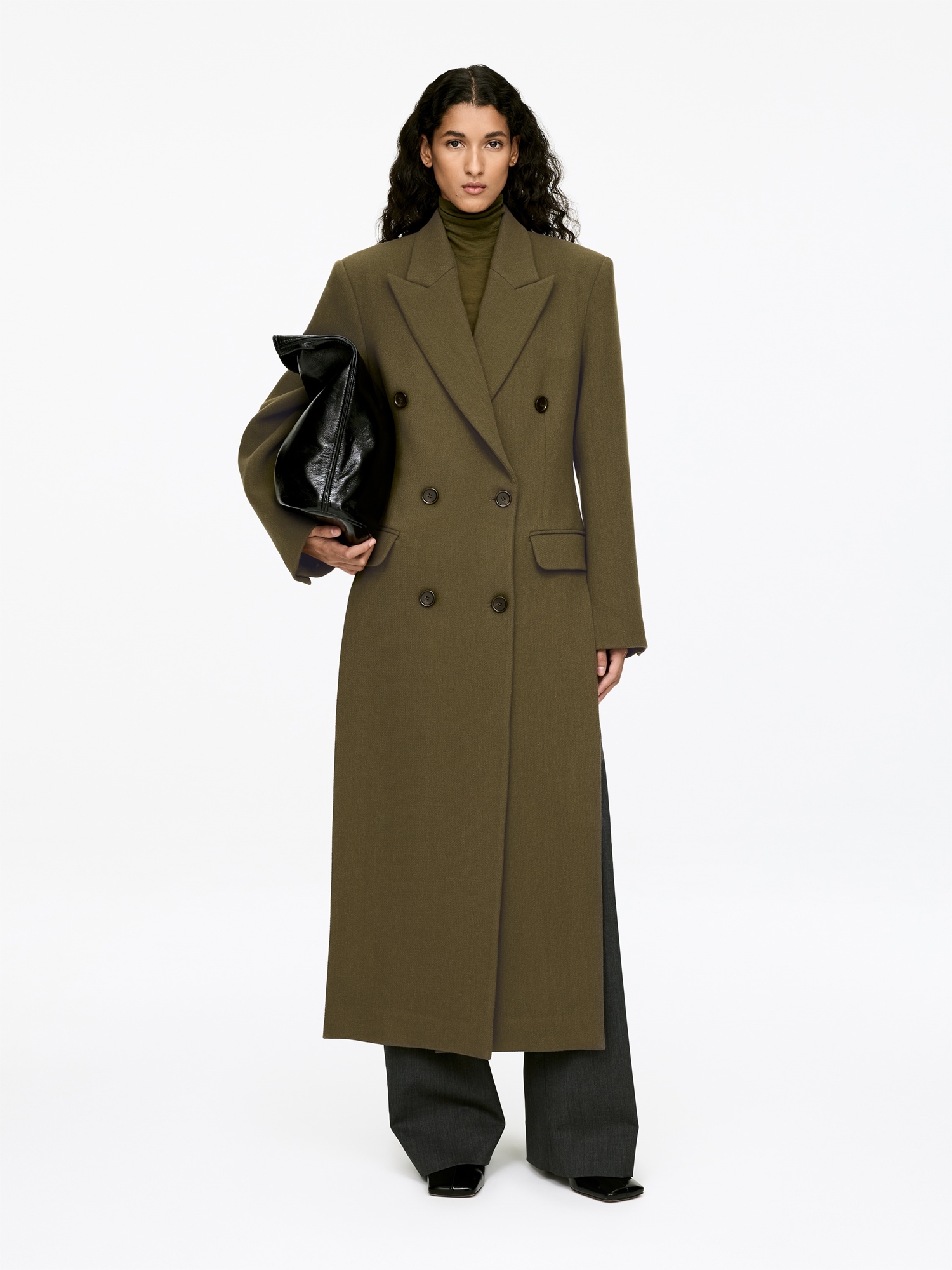 Приталенное двубортное пальто из шерстяной смеси с пике на лацкане и высокими боковыми вентиляционными отверстиями. Карманы с клапанами и манжеты на пуговицах.