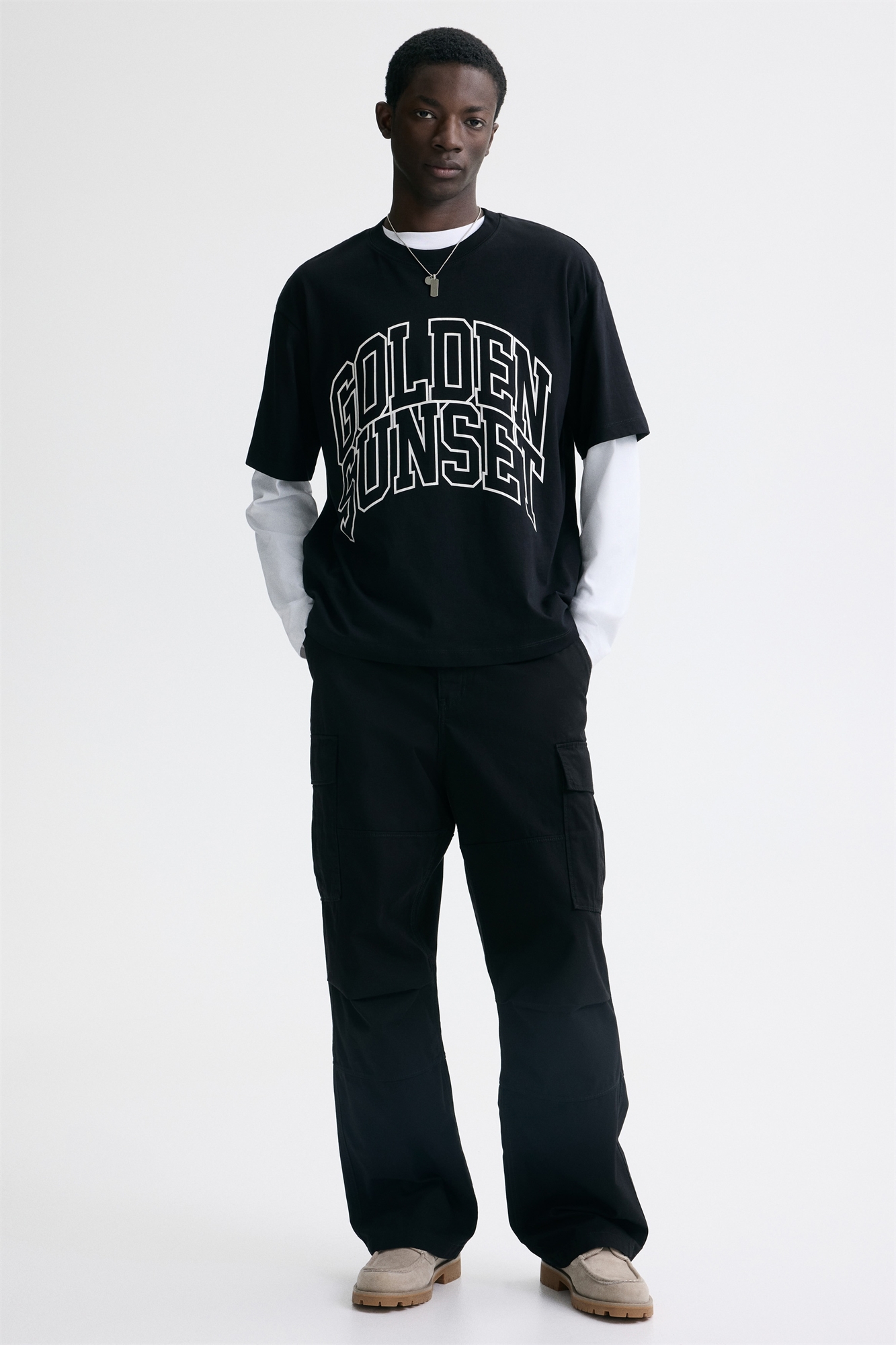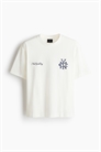 Футболка в стиле бокс из легкого хлопкового джерси с принтом, ребристой горловиной, спущенными плечами и прямым покроем. Свободный крой для объемного, но не чрезмерно большого силуэта.
