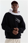 Толстовка из плотной хлопчатобумажной смеси с мягкой начесом внутри и набивным рисунком. Двухслойный капюшон, спущенные плечи и длинные рукава. Карман-кенгуру, манжеты и подол в рубчик. Свободный крой для объемного, но не чрезмерно большого силуэта.