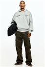 Толстовка из плотной хлопчатобумажной смеси с мягкой начесом внутри и набивным рисунком. Двухслойный капюшон, спущенные плечи и длинные рукава. Карман-кенгуру, манжеты и подол в рубчик. Свободный крой для объемного, но не чрезмерно большого силуэта.
