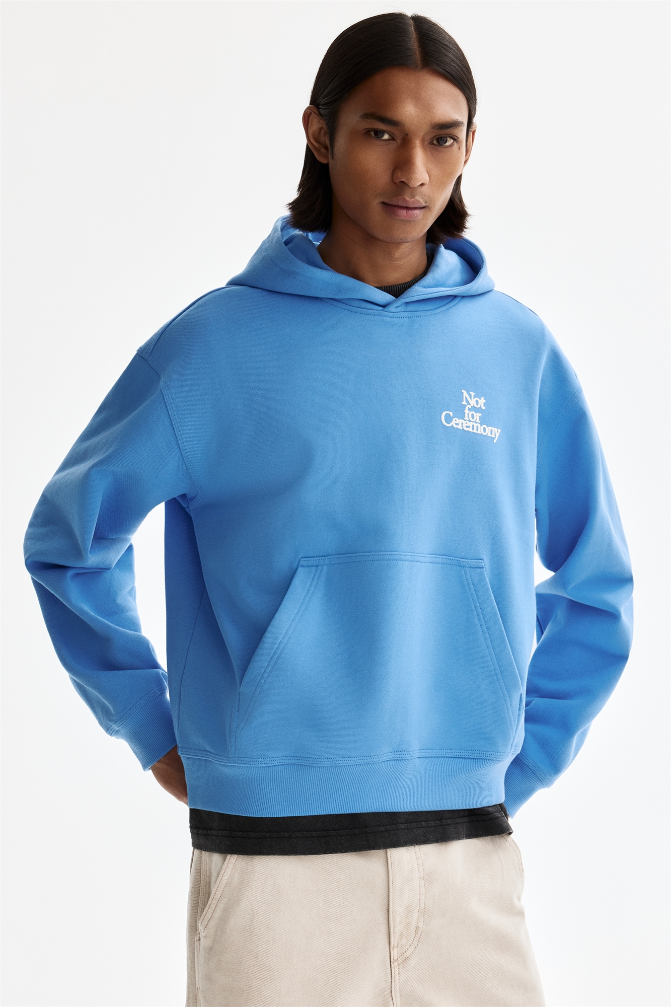 Худи из хлопчатобумажной ткани с мотивными деталями. Спущенные плечи, длинные рукава, карман-кенгуру и широкая резинка на манжетах и подоле. Свободный крой для просторного, но не слишком объемного силуэта.