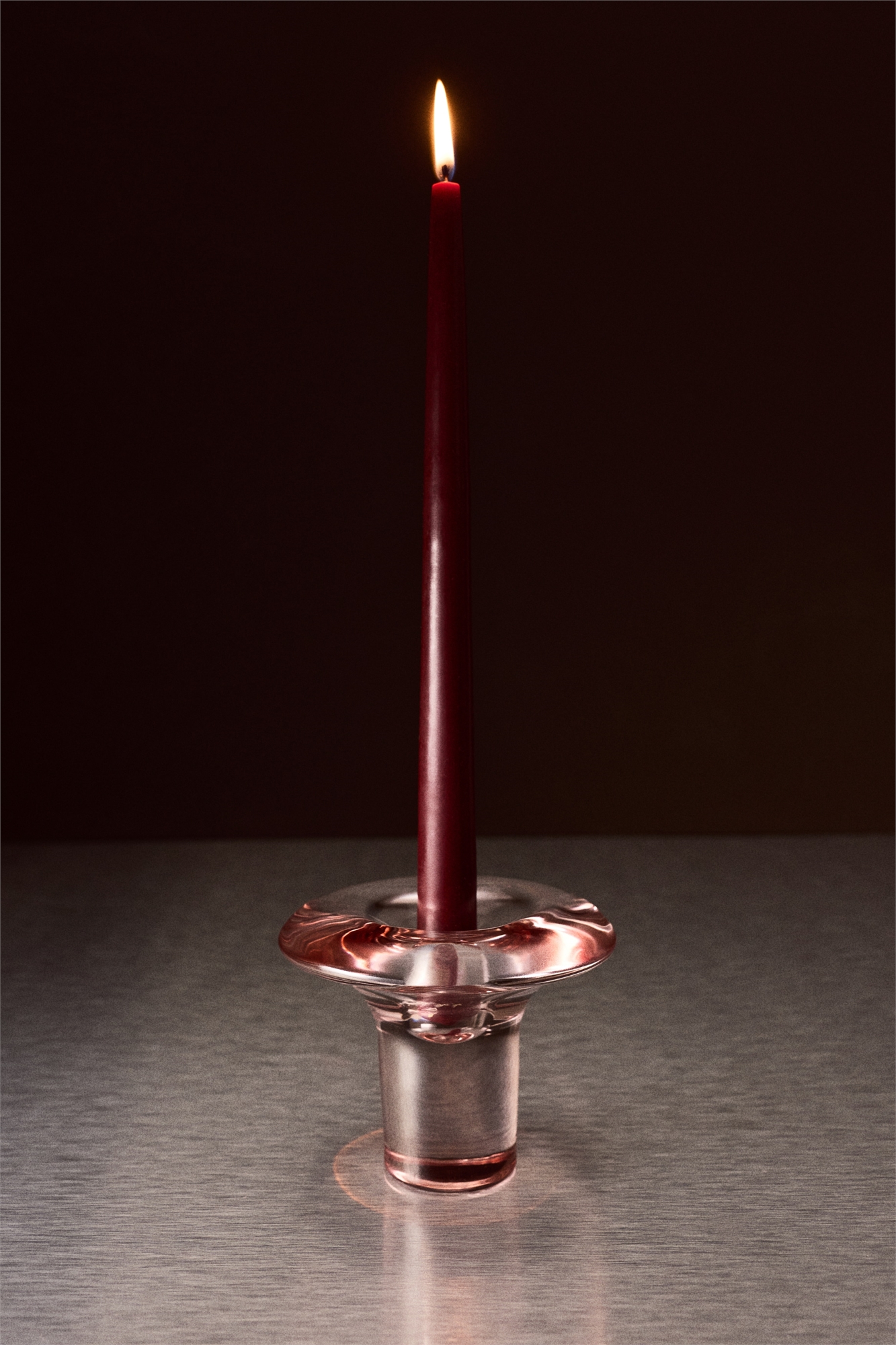 Высокий стеклянный подсвечник с расклешенной верхней частью. Изогнутая форма и гладкая поверхность прекрасно улавливают и отражают свет свечи, придавая мягкое сияние и скульптурную элегантность любой обстановке.