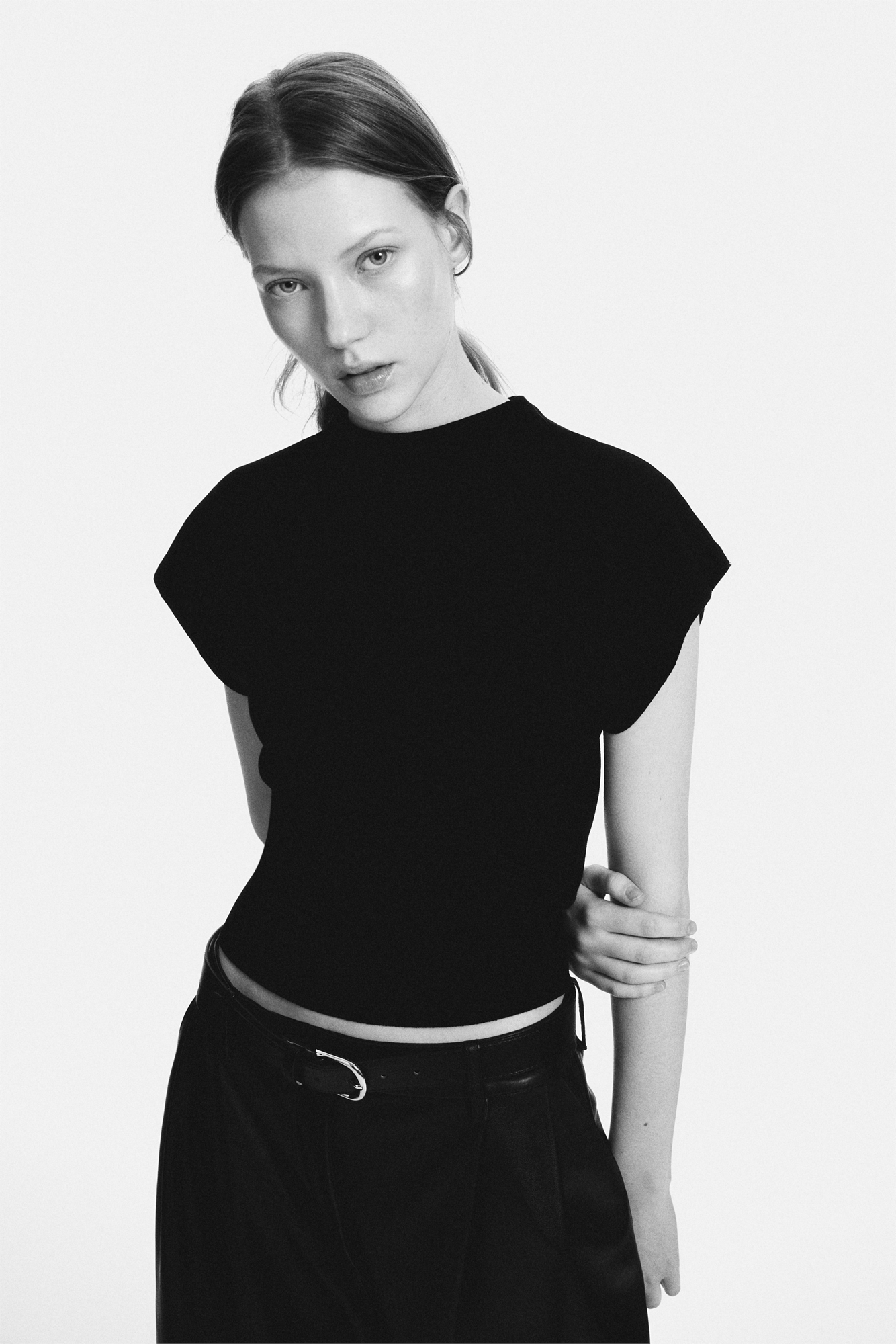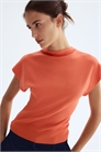 Топ из тонкого плотного трикотажа с небольшим воротником-стойкой, рукавами-капителью и окантовкой по подолу.