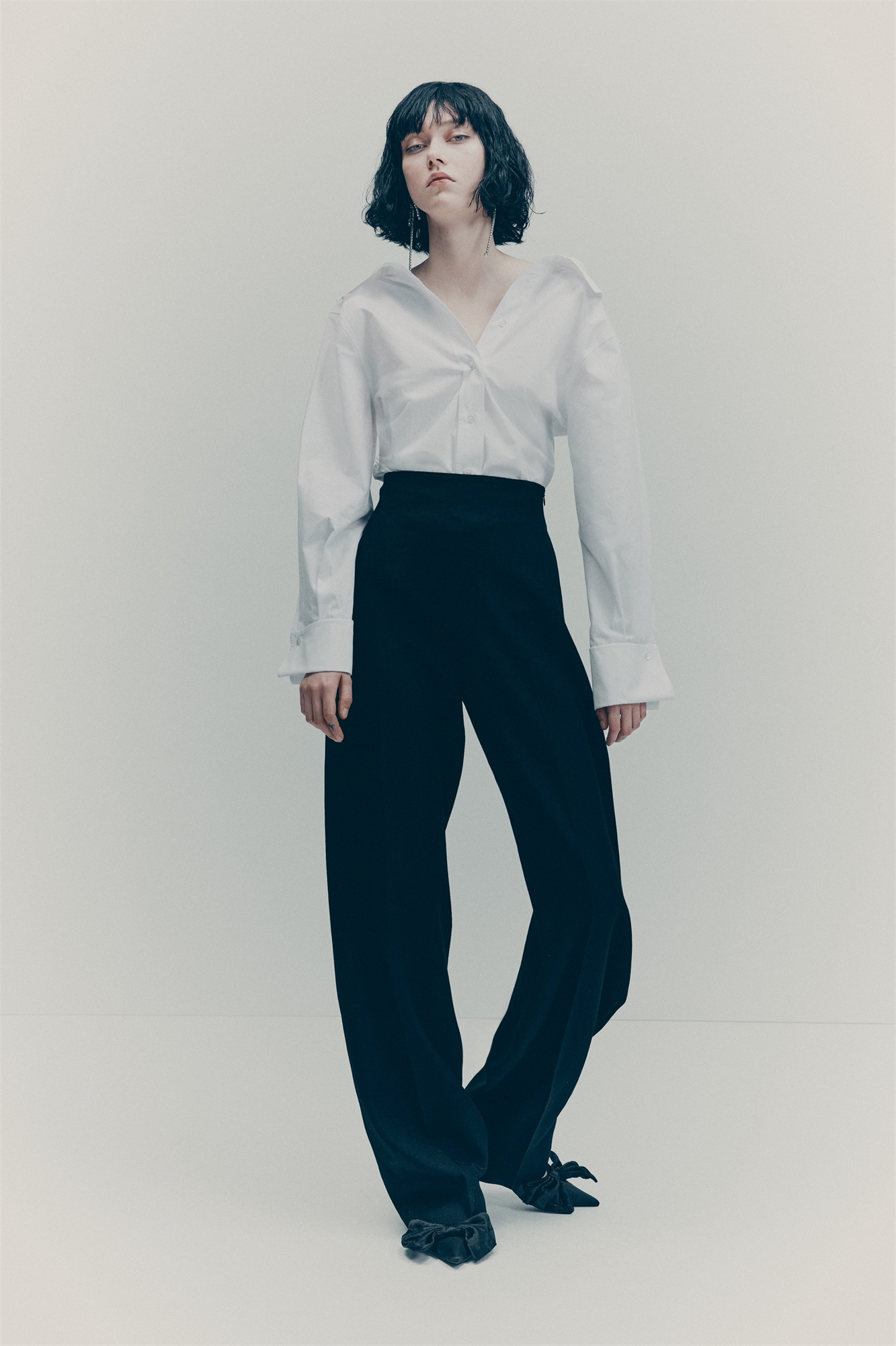 Облегающая хлопковая рубашка в непринужденном стиле с отложным воротником, сидящим на плечах. V-образный вырез, застежка на пуговицы спереди, двухслойный узел сзади, длинные рукава со складками и отложными манжетами с пуговицей. Подол мягко закруглен.