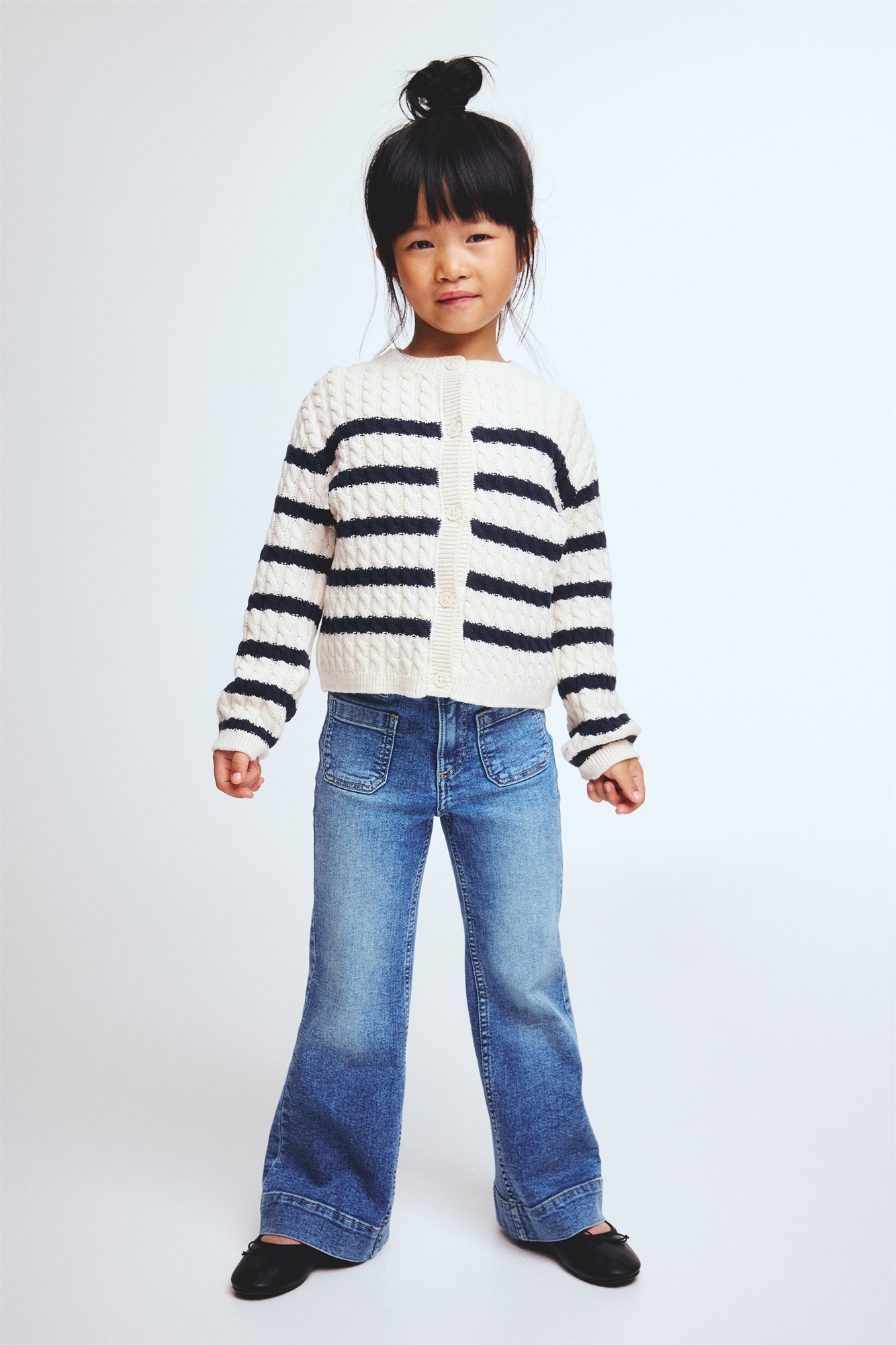 Джинсы из мягкого денима из смеси хлопка. Регулярная посадка по бедрам и ляжкам с расклешенными ногами. Регулируемая резинка на талии, ширинка на молнии с кнопкой, накладные передние карманы и открытые задние карманы.