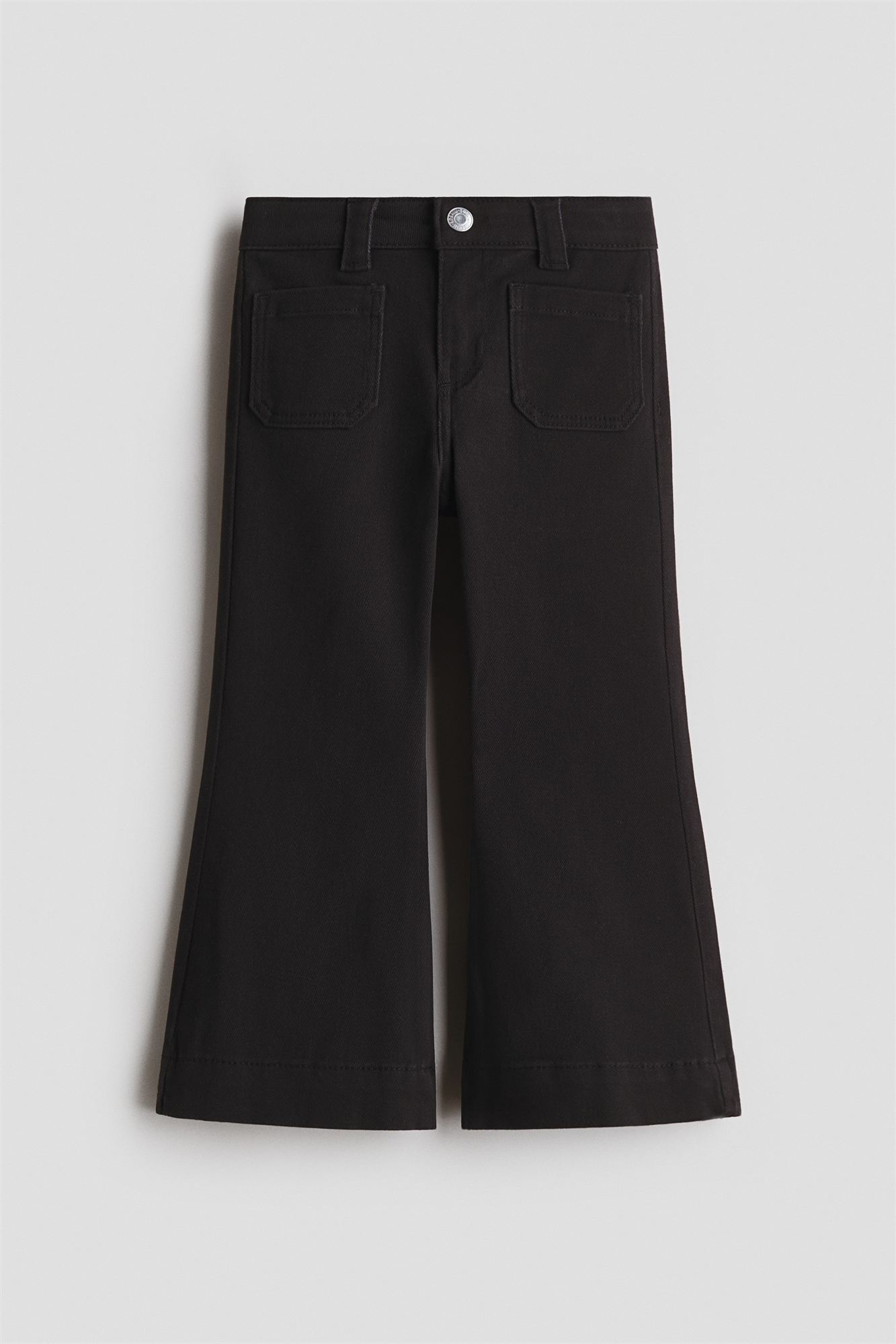 Джинсы из мягкого денима из смеси хлопка. Регулярная посадка по бедрам и ляжкам с расклешенными ногами. Регулируемая резинка на талии, ширинка на молнии с кнопкой, накладные передние карманы и открытые задние карманы.