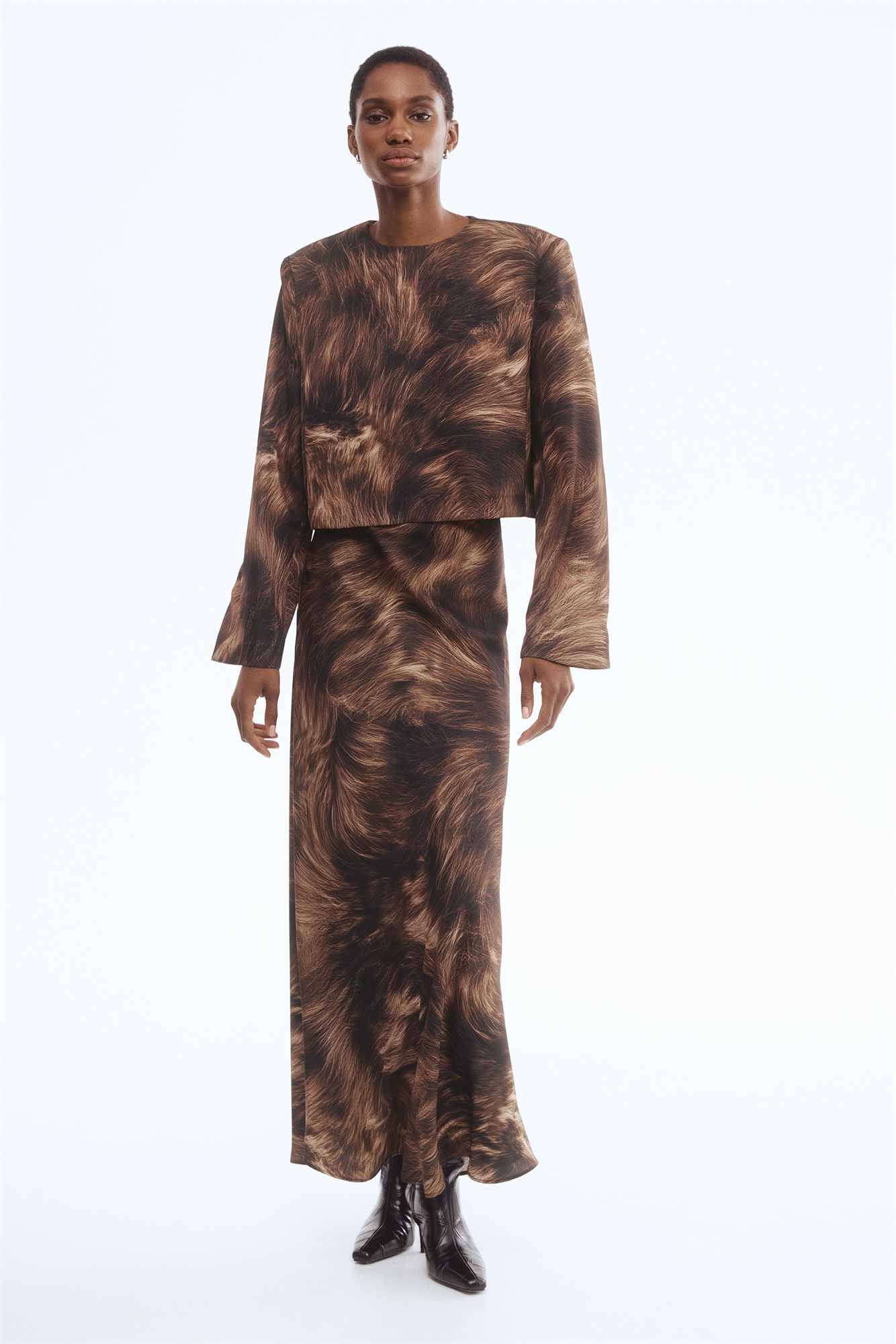 Длинная приталенная юбка из саржи с принтом на всю длину. Регулярная талия с вытачками сзади и потайной застежкой на молнию и крючок с глазом с одной стороны. Высокий разрез с одной стороны. Без подкладки.