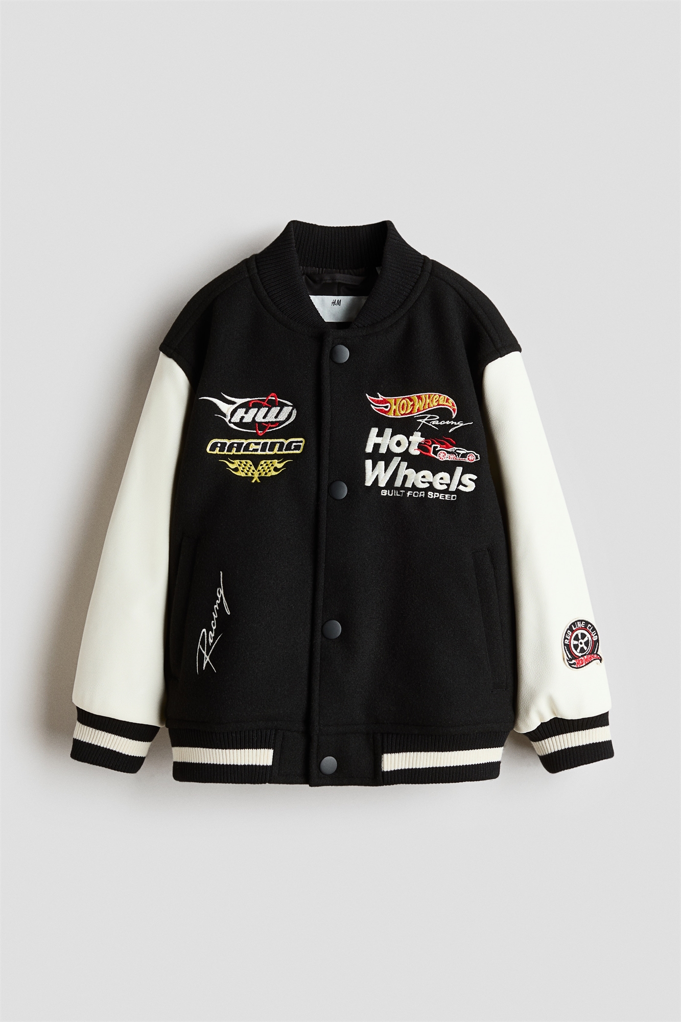Бейсбольная куртка из войлока с деталями из мотивов и рукавами контрастного цвета. Ребристый воротник-стойка, застежки на кнопках спереди и прорезные боковые карманы. Широкая ребристая отделка на манжетах и подоле. На подкладке.