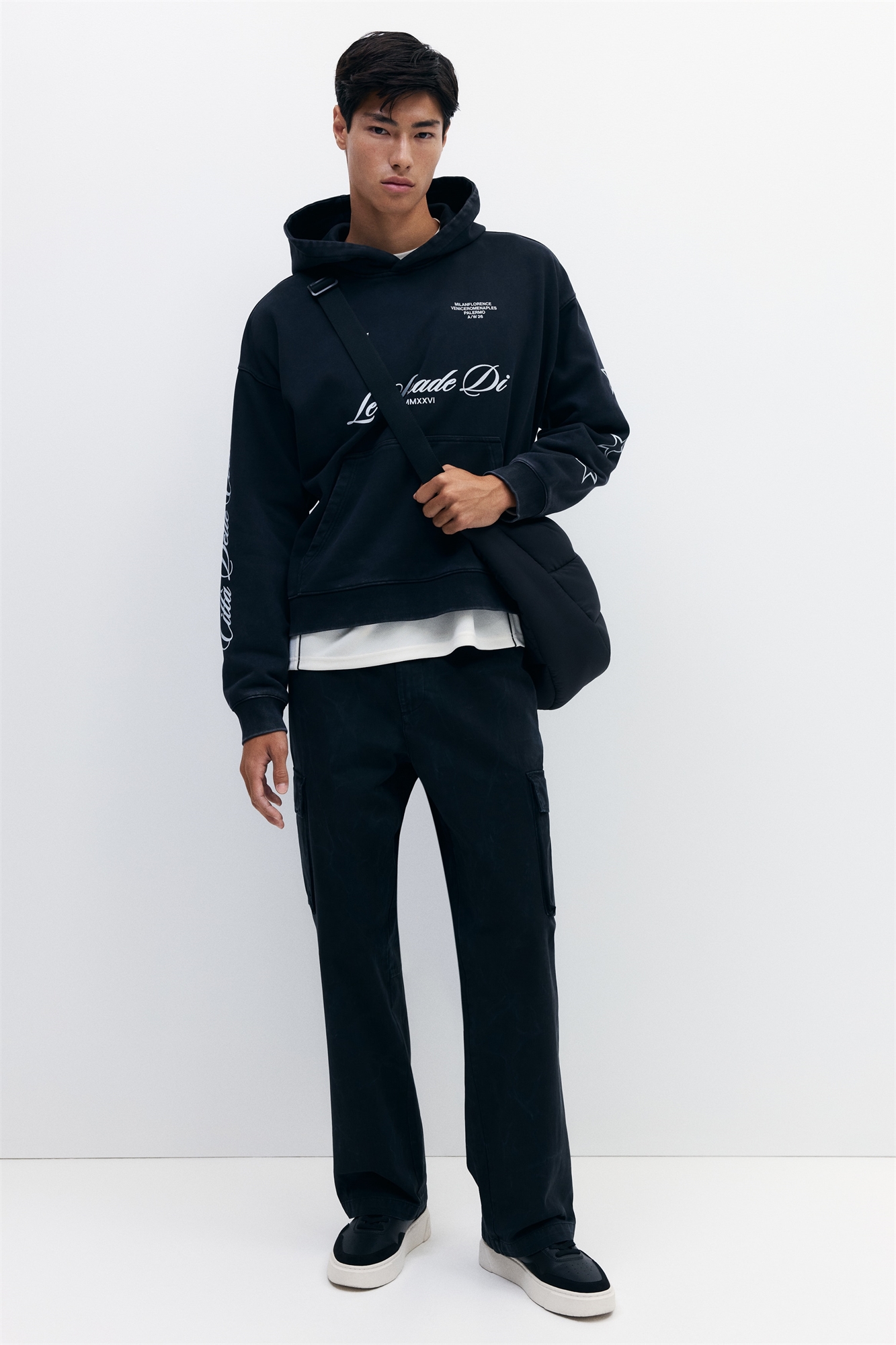 Брюки-карго из хлопковой саржи с эластичной вставкой сзади на талии, ширинкой на молнии и пуговицей. Накладные карманы с клапанами и потайными кнопками на ногах и сзади. Свободный крой для непринужденного, но не чрезмерного силуэта.