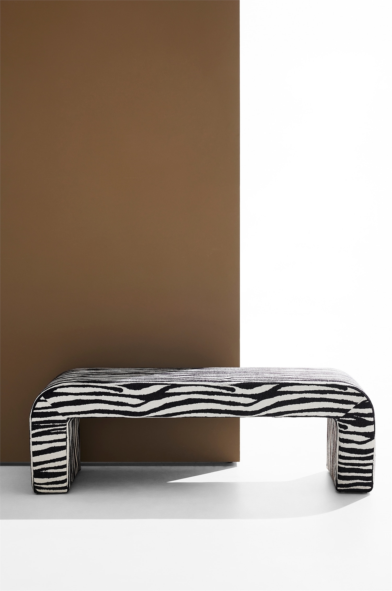 Скамья Odette - это стильный предмет мебели интересной формы с рисунком зебры. Она подходит для различных помещений и условий использования: В качестве скамьи в спальне, пуфика в гостиной или сиденья в прихожей. Материал: Каркас изготовлен из сосны и фанеры и обтянут прочной обивкой из холодного поролона для дополнительного комфорта. Чехол не снимается. Размеры: ширина 41 см, высота 40 см, длина/глубина 120 см, глубина сиденья 41 см.