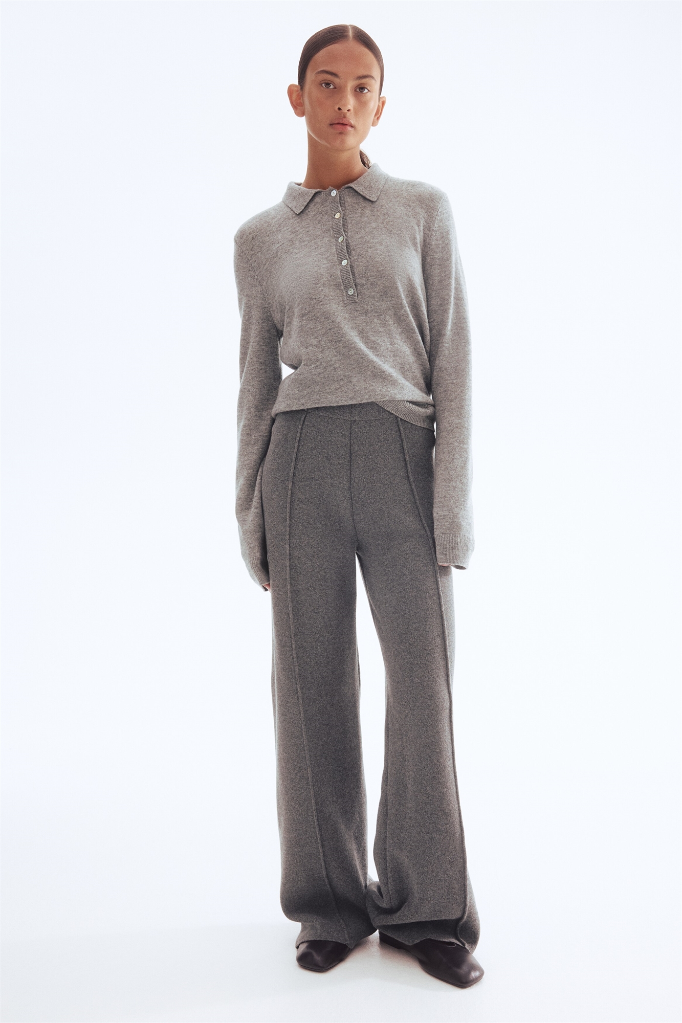 Брюки из мягкого трикотажа с высокой эластичной талией и широкими штанинами с застроченными складками спереди.