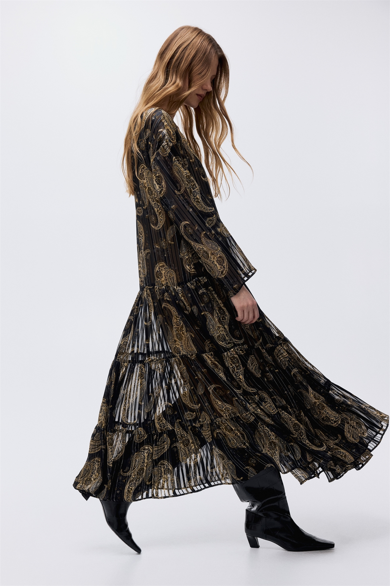 Платье длиной до щиколотки из воздушного шифона с принтом и мерцающими нитями. Вырез-лодочка с отверстием для ключа и пуговицей сзади. Длинные рукава, узкий пояс на талии и многоярусная юбка со складками. Частично на подкладке.