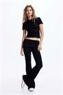 Расклешенные леггинсы из тонкого трикотажа в рубчик с откидным поясом и сборками по бокам для создания эффекта легкой драпировки.