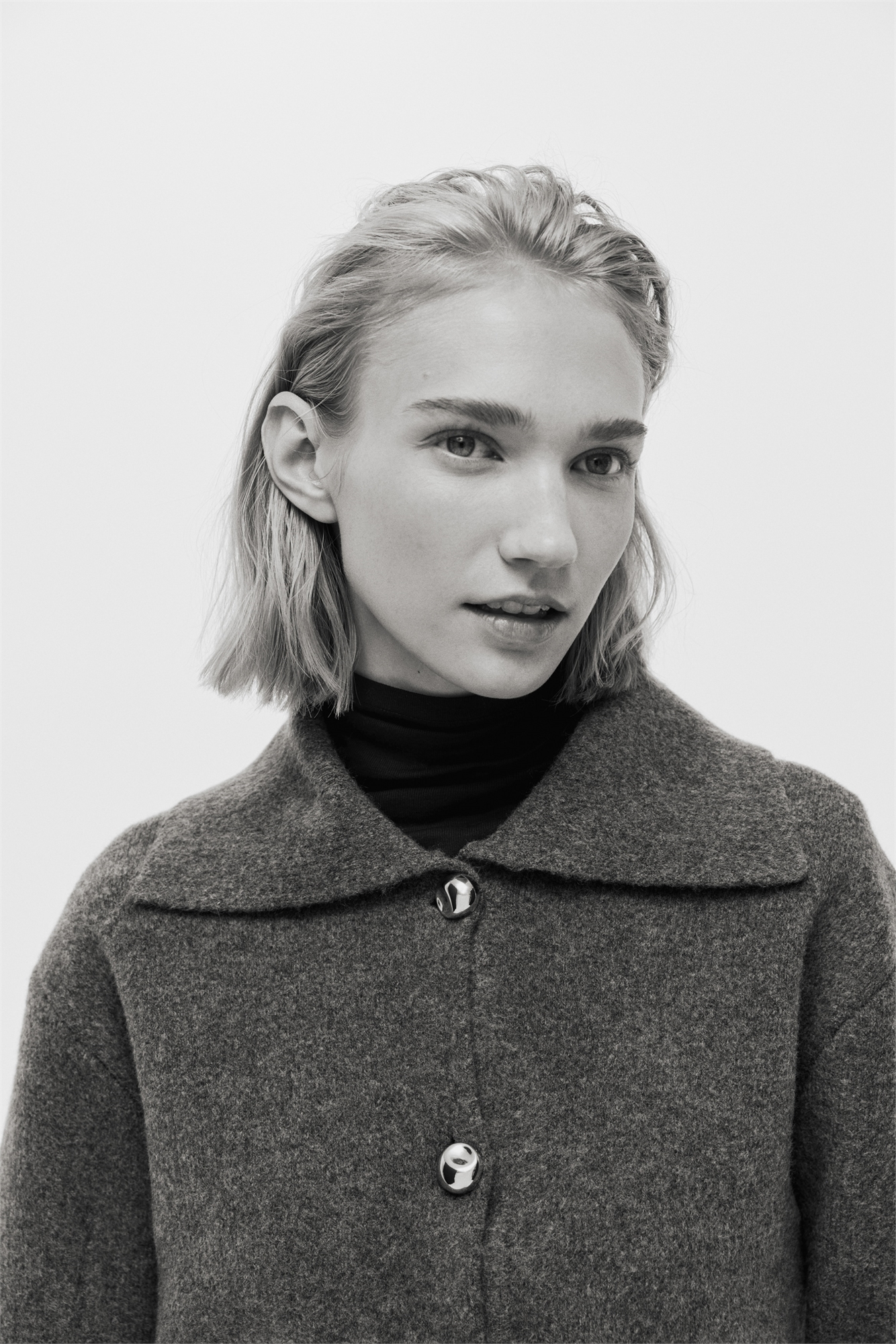 Кардиган из мягкого трикотажа с небольшим содержанием шерсти и слегка войлочной поверхностью. Широкий воротник, пуговицы спереди и расклешенный подол.