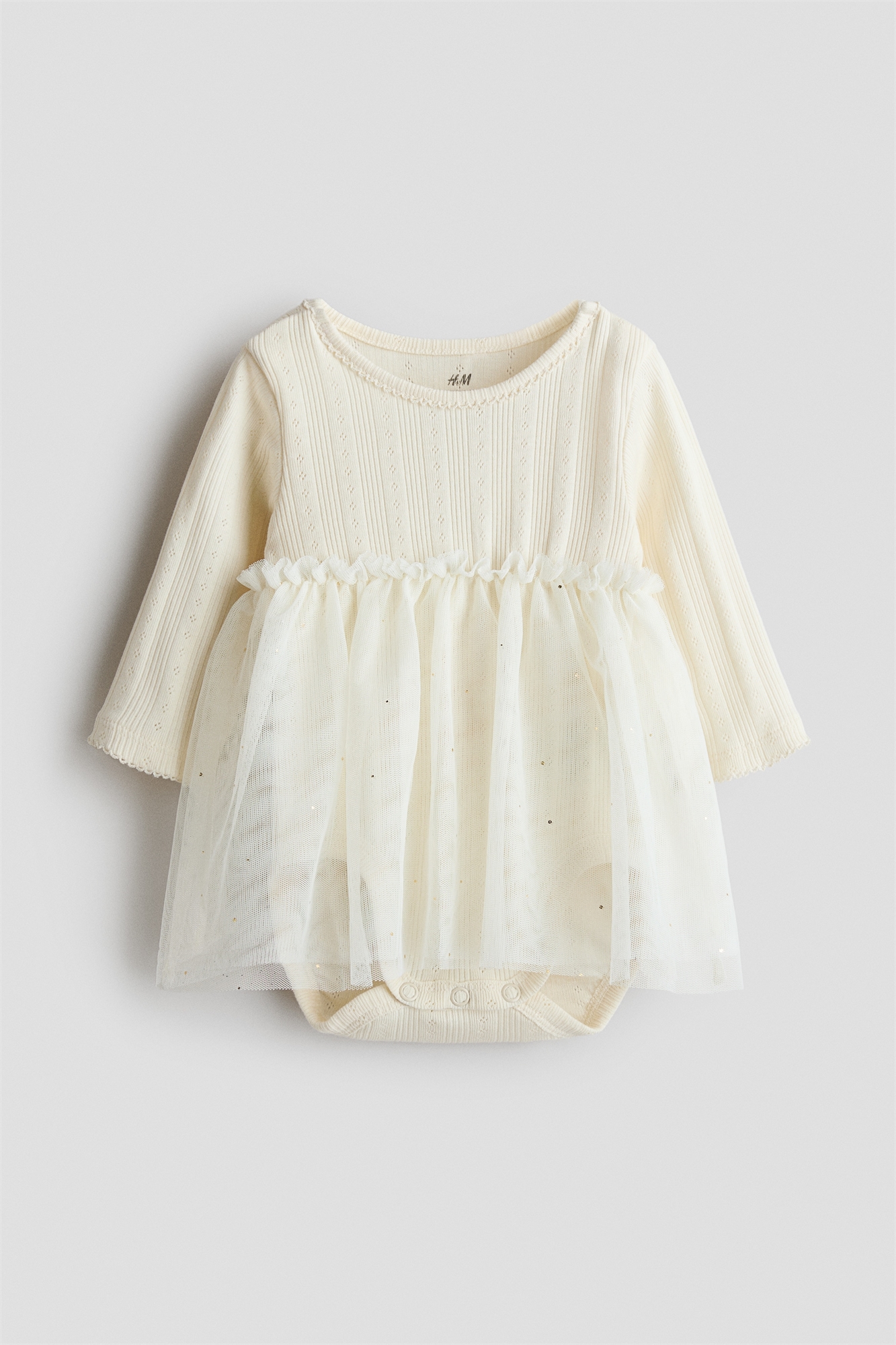 Платье-боди из мягкого хлопкового пуантельевого джерси с юбкой из блестящего тюля. Круглый вырез с отделкой пико, пуговица на каждом плече и длинные рукава с манжетами с отделкой пико. Маленькая оборка на талии и застежки внизу для удобства переодевания. Швы вокруг ножек для более удобного и плотного прилегания подгузника.