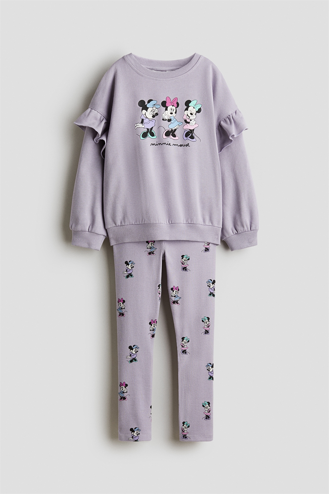 Хлопковый комплект, состоящий из топа с длинными рукавами из легкой толстовки и леггинсов из ребристого джерси. Топ с мотивом спереди, круглым вырезом с ребристой отделкой и спущенными плечами с окантовкой. Ребристые манжеты и подол. Леггинсы с эластичной талией.