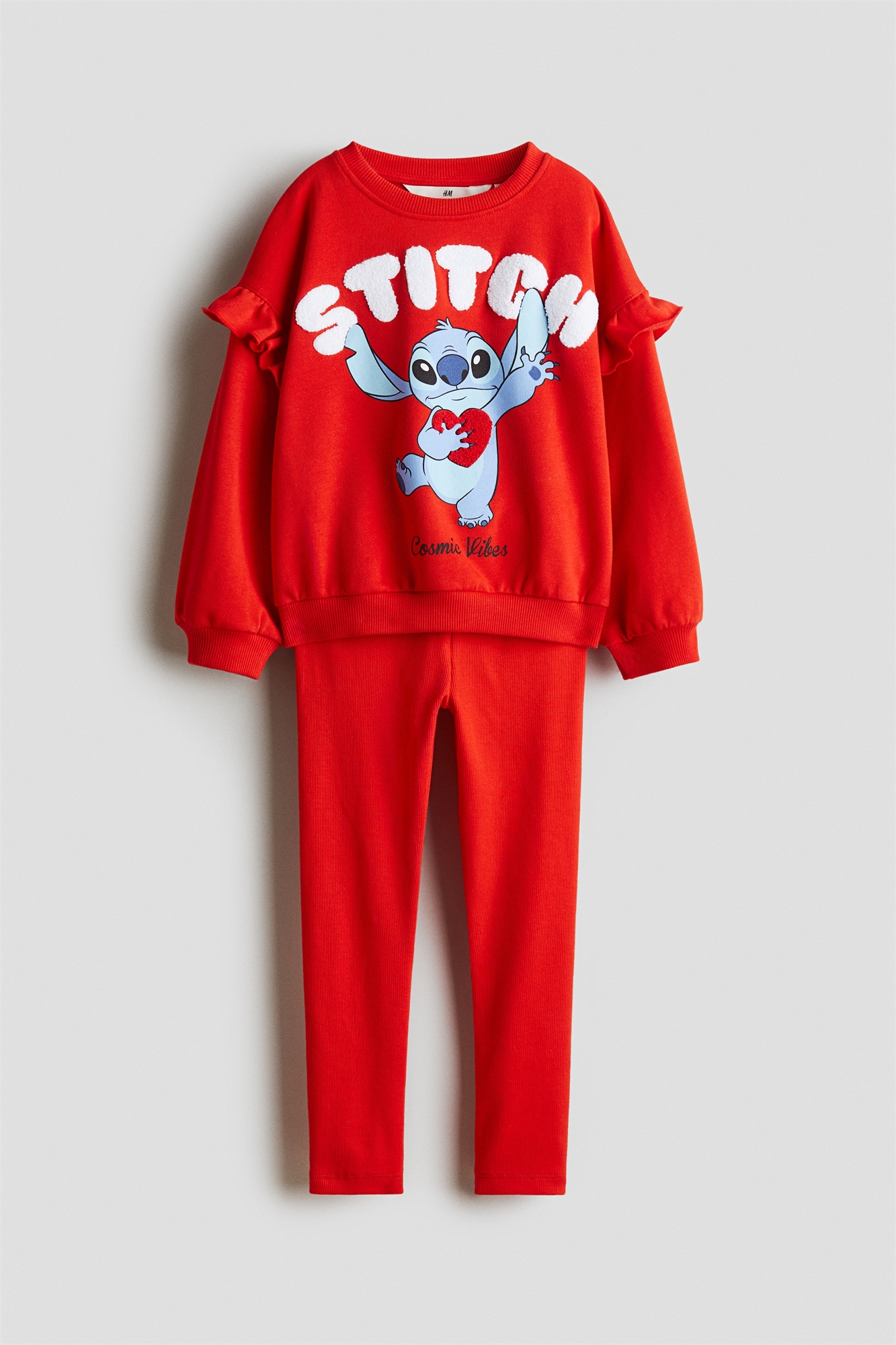 Хлопковый комплект, состоящий из топа с длинными рукавами из легкой толстовки и леггинсов из ребристого джерси. Топ с мотивом спереди, круглым вырезом с ребристой отделкой и спущенными плечами с окантовкой. Ребристые манжеты и подол. Леггинсы с эластичной талией.