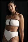 Бандо-топ с подкладкой, скрытой силиконовой окантовкой по верху, косточками по бокам и чашками со съемными вставками, которые формируют грудь и обеспечивают хорошую поддержку. Без застежек.