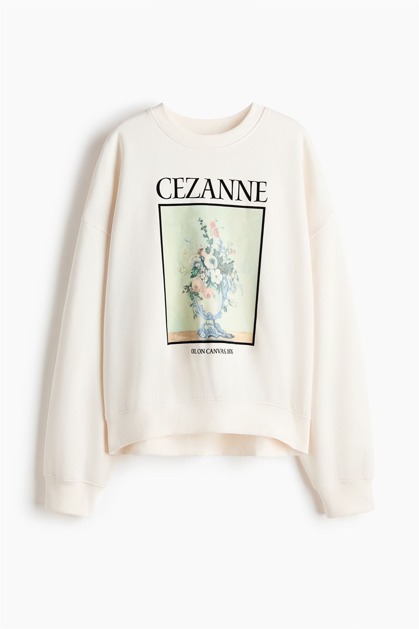 Топ оверсайз из принтованной толстовки с мягким начесом внутри. Круглый вырез с ребристой отделкой, спущенные плечи и длинные рукава. Ребристые манжеты и подол.