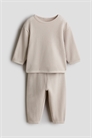 Комплект из топа и брюк из мягкого вафельного хлопкового джерси. Топ с круглым узким вырезом с застежками с одной стороны (кроме размеров 2-4Y), спущенными плечами и узкой обвязкой на манжетах и подоле. Брюки с регулируемой резинкой на талии. Подол отделан эластичной тесьмой.
