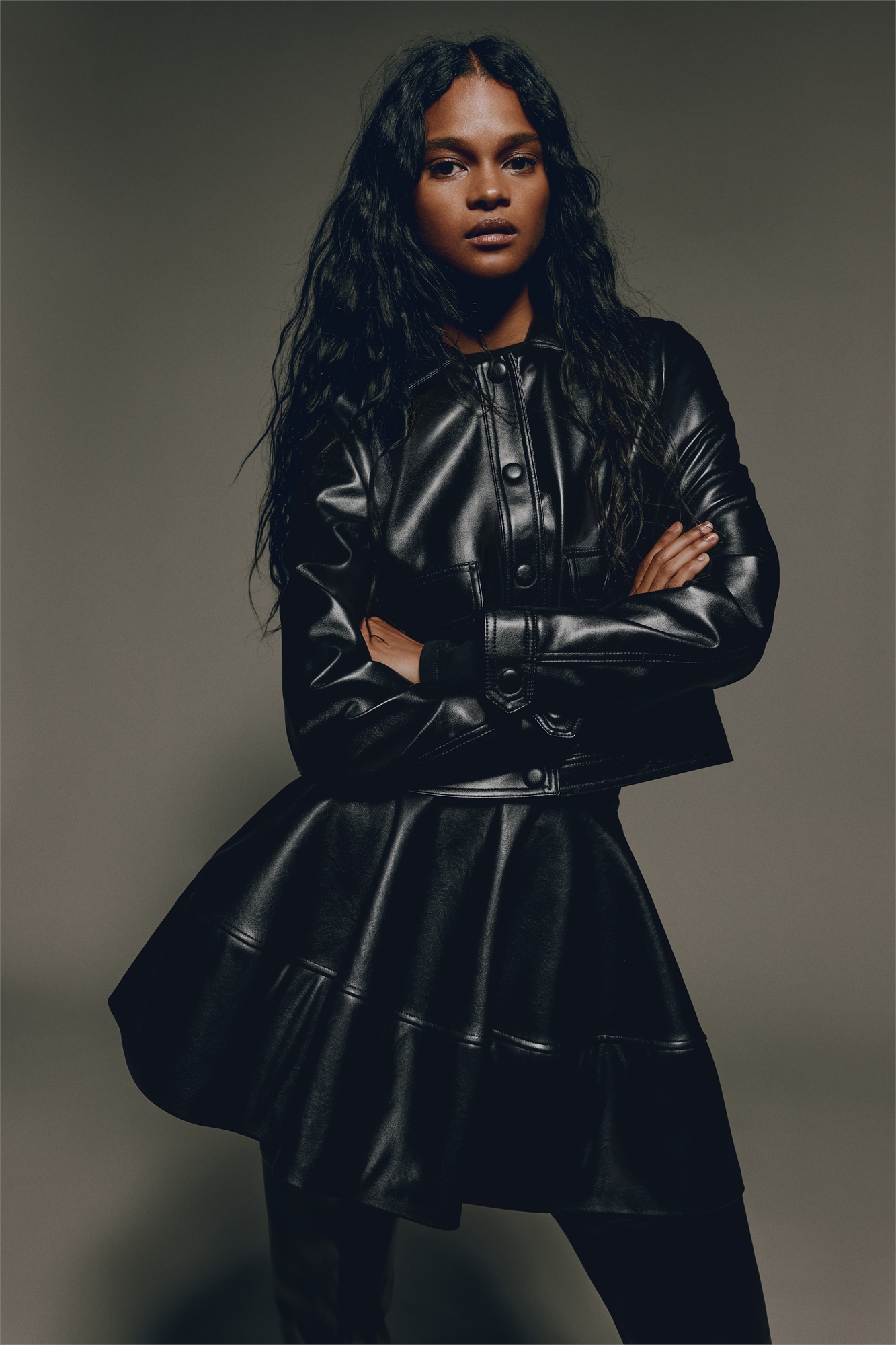 Короткий приталенный пиджак с воротником, закрытыми пуговицами спереди и накладными передними карманами. Сзади иголка и манжеты на пуговицах. На подкладке.