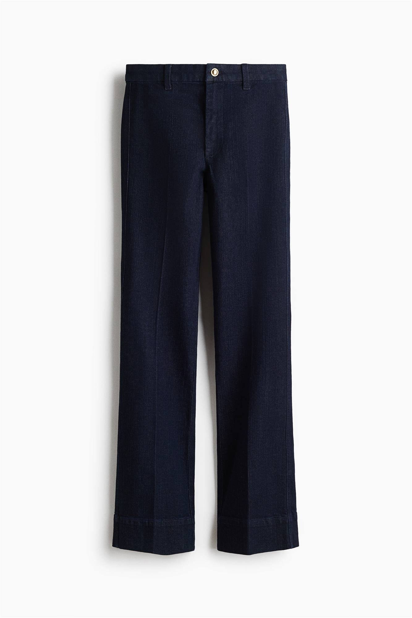 Джинсы из мягкого денима, слегка тянущегося и обеспечивающего комфорт. Расклешенные штанины с зауженной посадкой от талии до бедра и расклешенным кроем от колена до подола. Высокая талия, ширинка на молнии и пуговице, а также накладные карманы сзади. Регулярная длина, разработанная так, чтобы доходить до верхней части стопы с минимальной или нулевой стопой. Определяющая форма из сезона в сезон.