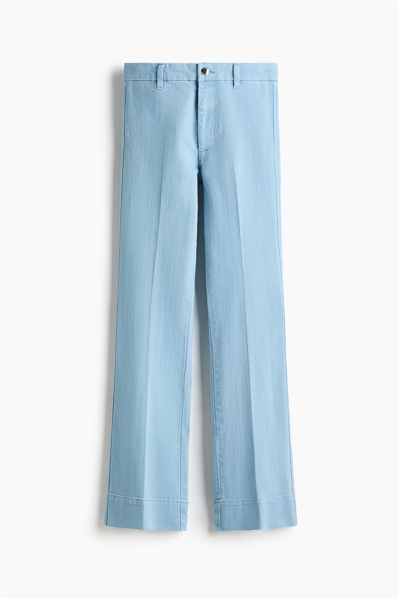 Джинсы из мягкого денима, слегка тянущегося и обеспечивающего комфорт. Расклешенные штанины с зауженной посадкой от талии до бедра и расклешенным кроем от колена до подола. Высокая талия, ширинка на молнии и пуговице, а также накладные карманы сзади. Регулярная длина, разработанная так, чтобы доходить до верхней части стопы с минимальной или нулевой стопой. Определяющая форма из сезона в сезон.