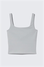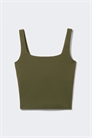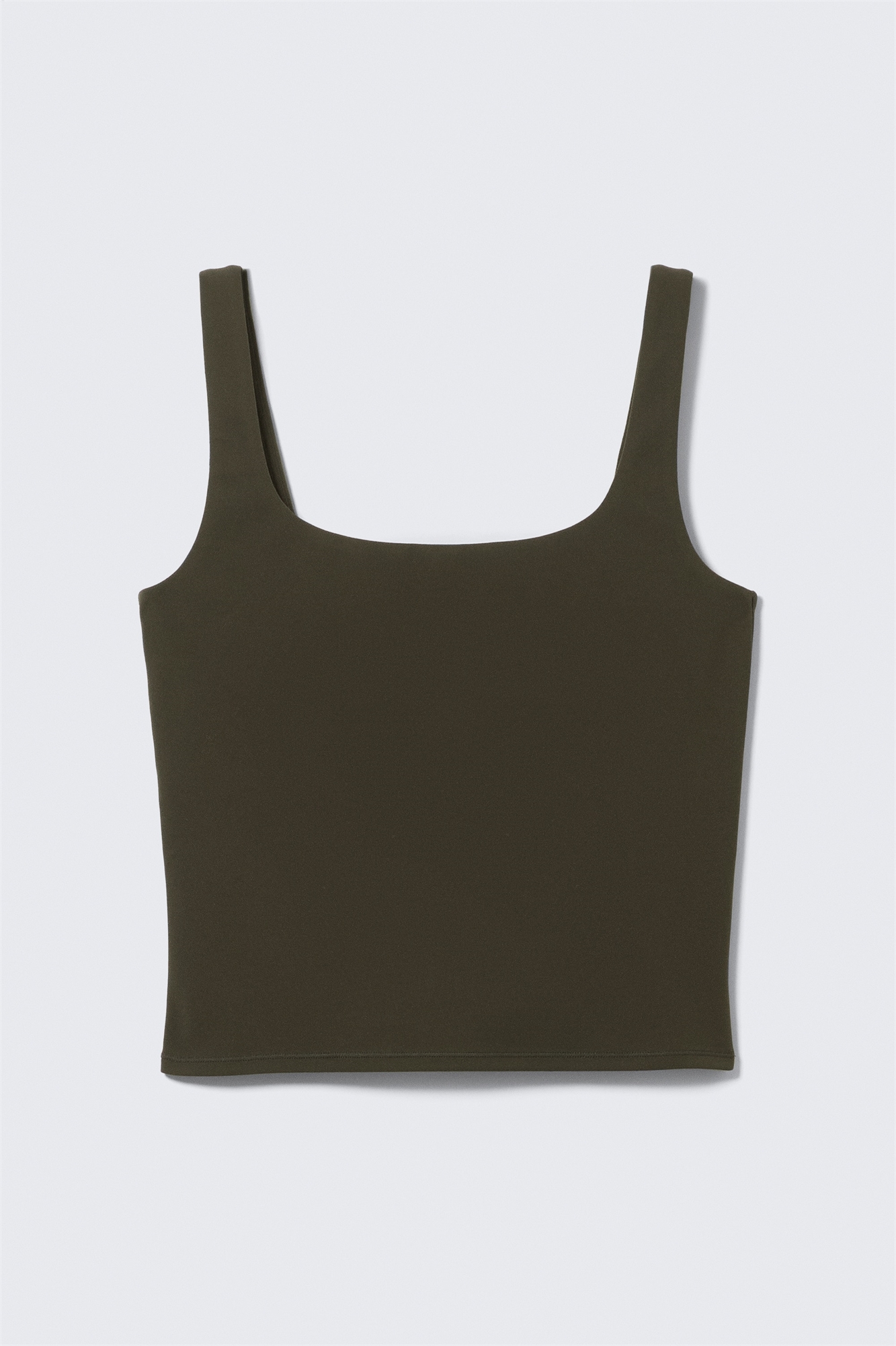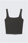 Обрезанный спортивный топ из супермягкой и эластичной ткани. Он входит в коллекцию Activewear и имеет облегающий крой, глубокий квадратный вырез и встроенный спортивный бюстгальтер для дополнительной поддержки.