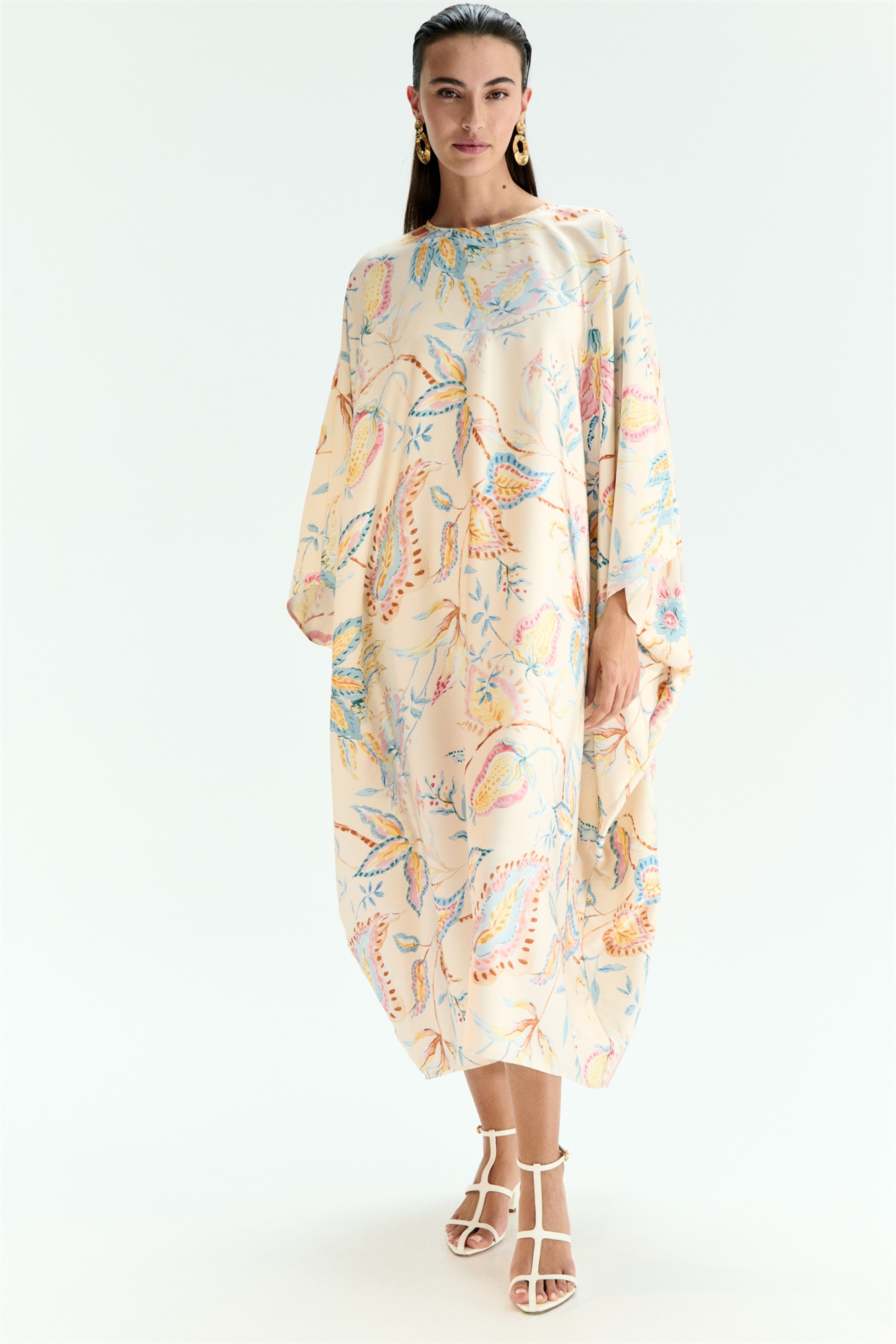Длинное платье-кафтан свободного кроя из мягко драпирующегося атласа. Имеет круглый вырез с разрезом и пуговицей сзади, а также удлиненные рукава. Без подкладки.