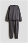 Комплект из топа и джоггеров из легкого толстовочного материала с мягкой ворсистой внутренней стороной и небольшими тканевыми аппликациями. Топ с круглым вырезом в рубчик, спущенными плечами, длинными рукавами и окантовкой на манжетах и подоле. Джоггеры с эластичным поясом на завязках, боковыми карманами и эластичной отделкой по подолу.