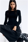 Облегающий топ из тонкого трикотажа в рубчик с вырезом-лодочкой, длинными рукавами и расклешенным пеплумом.