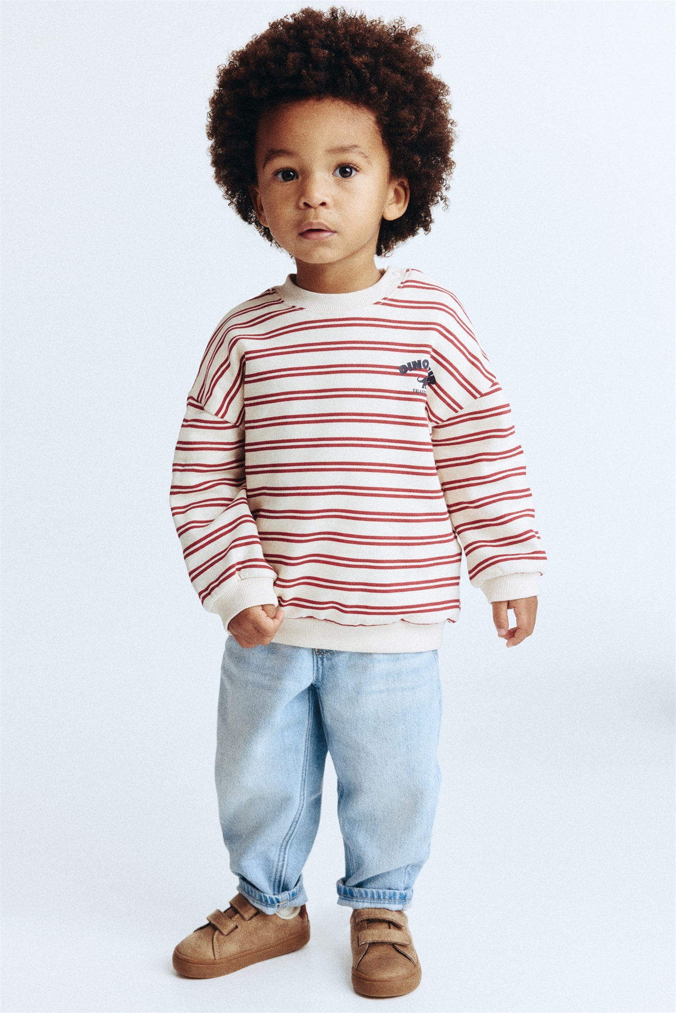 Топ из принтованной толстовки с мягкой ворсистой внутренней стороной. Круглый вырез с ребристой отделкой, застежки с одной стороны (кроме размеров 2-4Y), спущенные плечи и длинные рукава. Ребристые манжеты и подол.