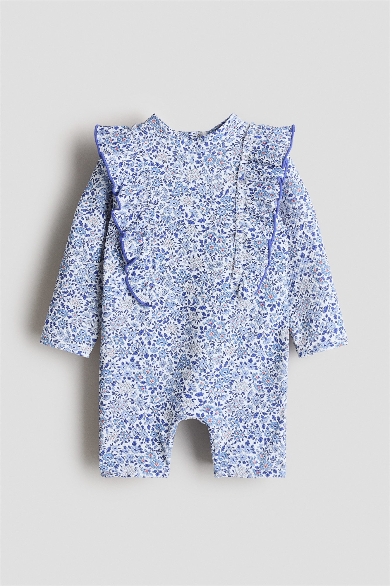 Купальник из фактурной ткани с УФ-защитой UPF 50 с милым цветочным принтом. Небольшой воротник-стойка и оборки спереди, переходящие на плечи и спину. Застежка-молния на спине с защитой от натирания, длинные рукава и короткие ноги. Коллекция H&M Adorables - это подборка удобных и качественных вещей, не теряющих актуальности.