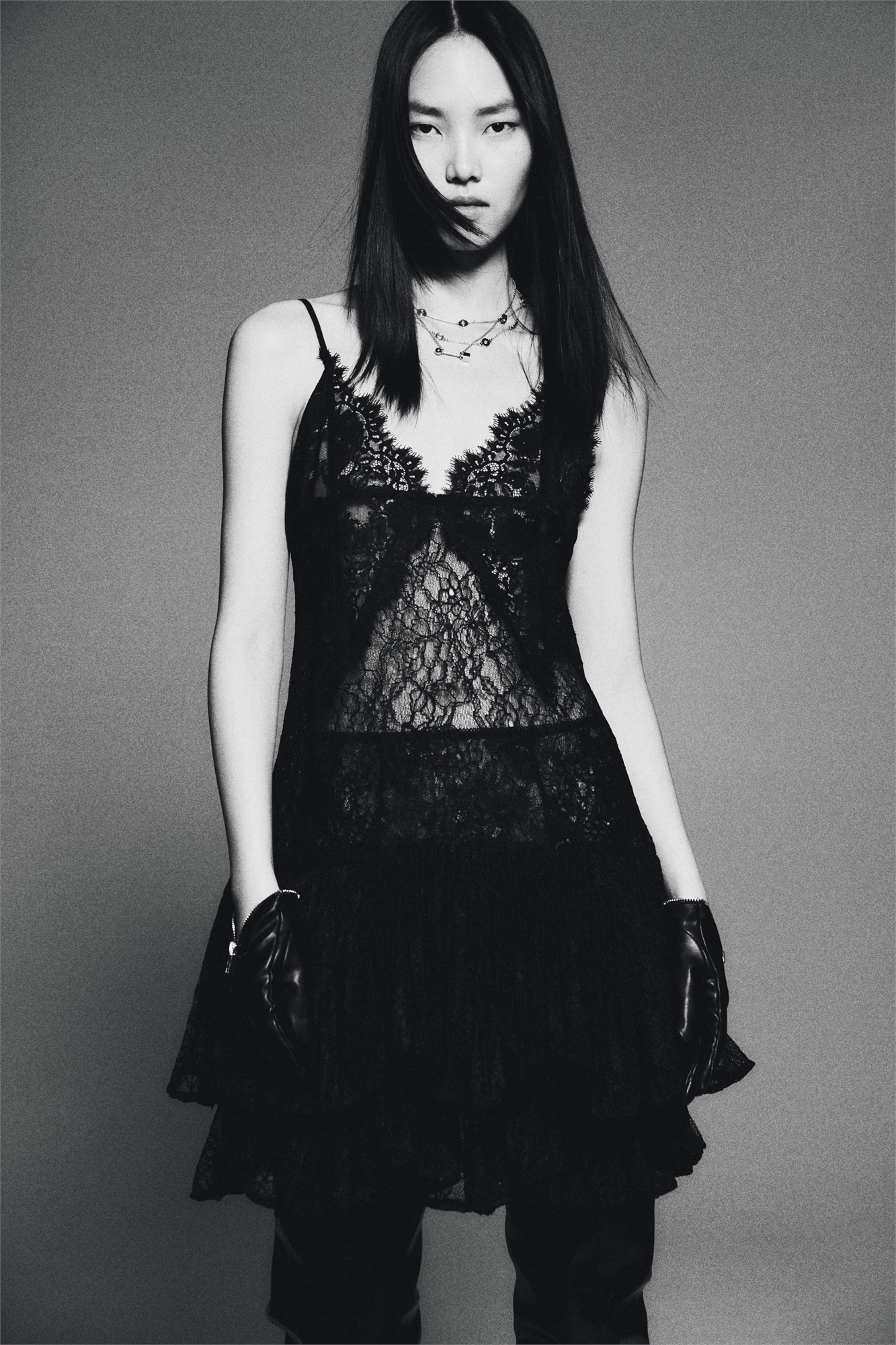 Короткое платье из кружева с узкими регулируемыми бретелями, глубоким V-образным вырезом спереди и потайной застежкой на молнию и крючок-глаз сзади. Двойные воланы из плиссированного кружева на подоле.