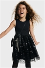 Платье без рукавов с лифом из плотного джерси и юбкой из тюля с блестками. Круглый вырез, отверстие под ключ с пуговицей сзади и многоярусная юбка с подкладкой из джерси.