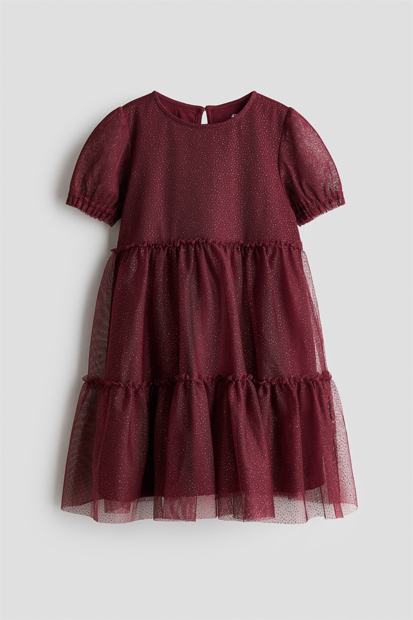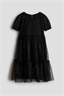 Платье из тюля с принтом из фольги. Круглый вырез с отверстием для ключа с пуговицей на затылке и короткие пышные рукава с эластичными манжетами. Многоярусная юбка с отделкой воланами и сборчатыми швами. На подкладке.