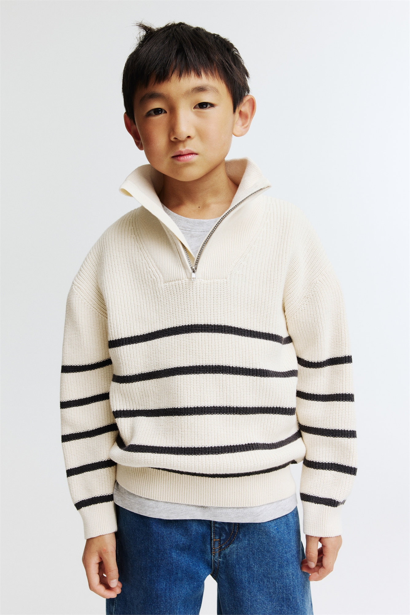 Джемпер из хлопка в рубчик с высоким воротником и застежкой-молнией с защитой подбородка от натирания в верхней части. Спущенные плечи, манжеты и подол в рубчик.