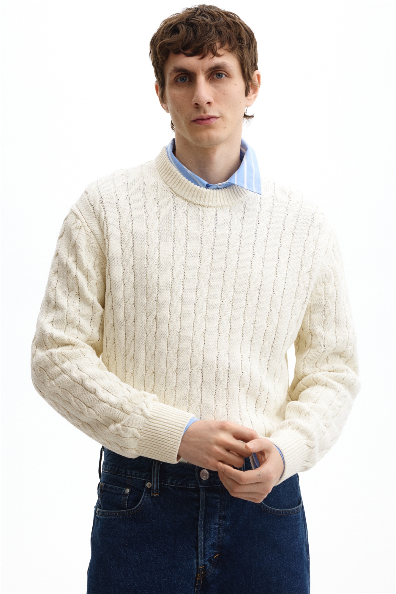 Джемпер из хлопка с узором «коса» с круглым ребристым вырезом и ребристой отделкой на манжетах и подоле. Классический крой и прямой силуэт для комфортной носки.
