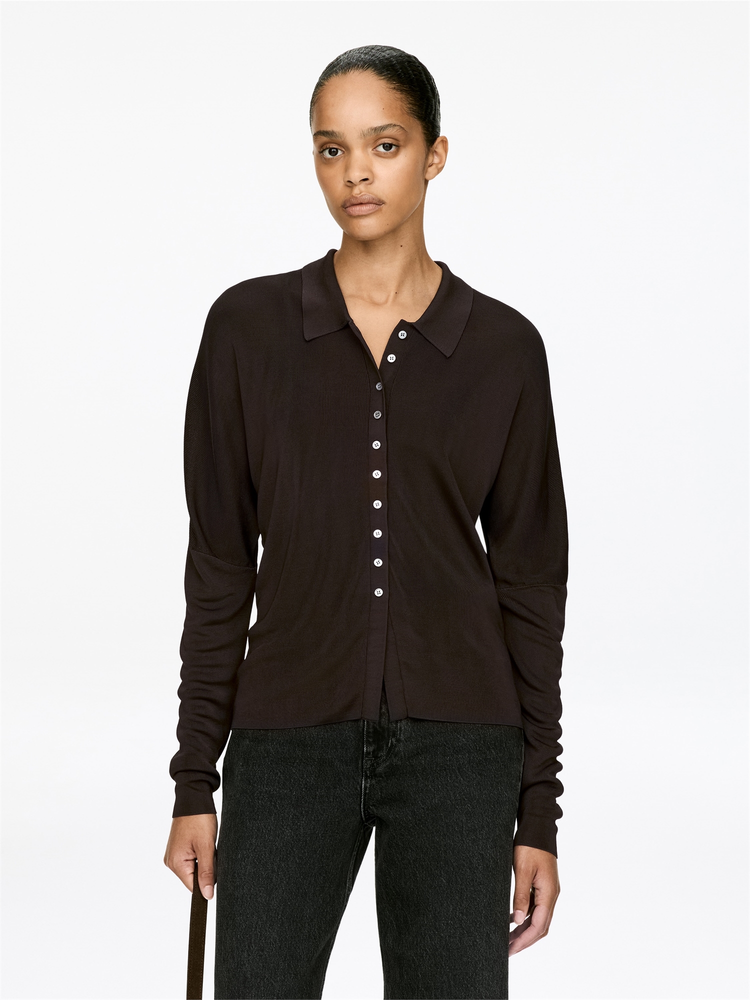 Рубашка из тонкой трикотажной вискозы с французскими плечами, застежкой на пуговицы и классическим рубашечным воротником.