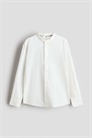 Рубашка из воздушной ткани, изготовленной из смеси льна и хлопка. Воротник-стойка, пуговицы спереди и кокетка сзади. Спущенные плечи и длинные рукава с манжетами на пуговицах и плашкой с пуговицей-связкой. Слегка закругленный подол.