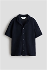Рубашка с короткими рукавами из воздушного текстурированного трикотажа с курортным воротником, пуговицами спереди и заниженными плечами.