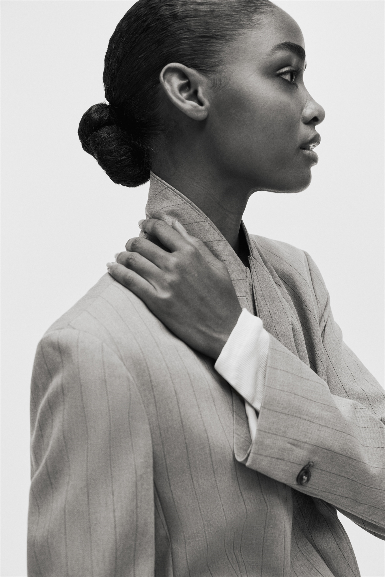 Однобортный блейзер из тканого материала с пикообразными лацканами, застежкой на пуговицу спереди и втачными передними карманами. Плечевые накладки, длинные рукава с манжетами на пуговицах и одна задняя отдушина. На подкладке.