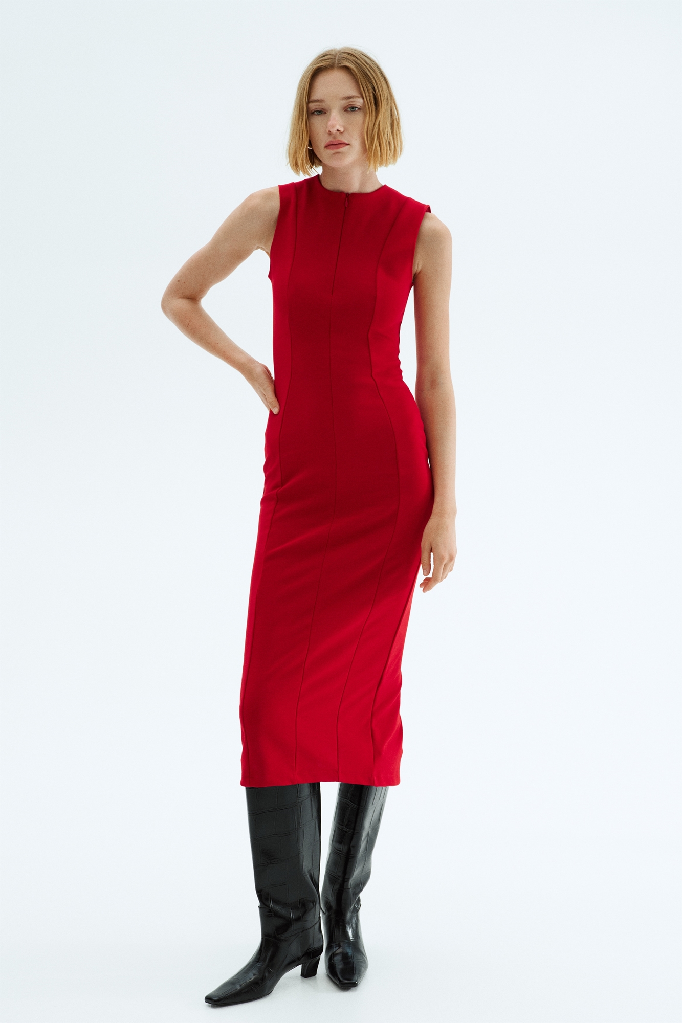 Платье без рукавов из плотного трикотажа интерлок с круглым вырезом и потайной застежкой-молнией спереди. Облегающий крой с формирующими швами спереди и подол прямого кроя с разрезом сзади.