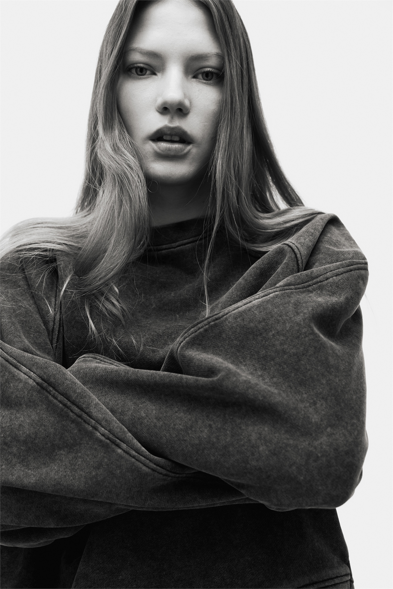 Свободный топ из легкой хлопковой ткани с потертым видом. Ребристая горловина, длинные рукава реглан, ребристые манжеты и подол.