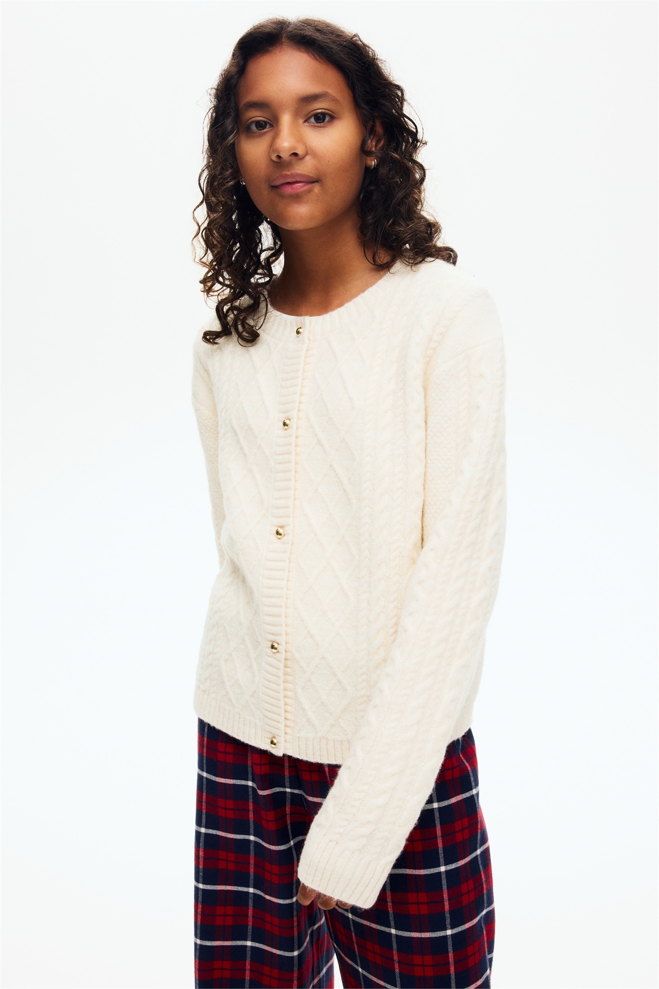 Кардиган из мягкого трикотажа с круглым вырезом в рубчик, пуговицами цвета металлик спереди и ребристой тесьмой на пуговицах, манжетами и подолом.